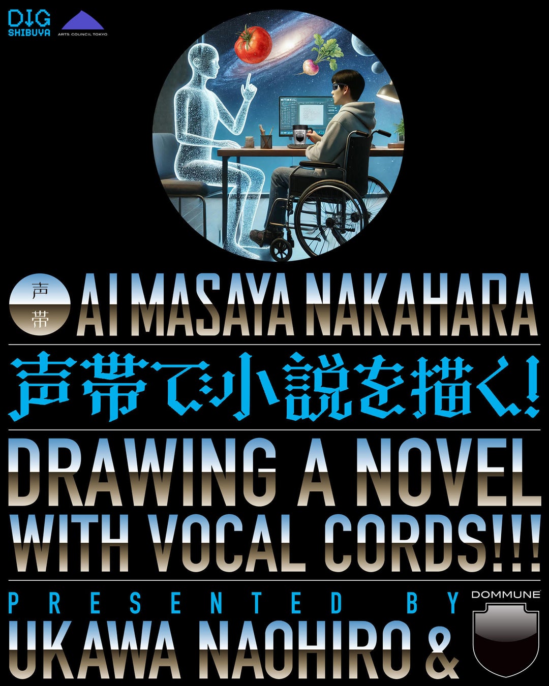 中原昌也の全ての小説と自伝と膨大な批評とインタビューを、その作家性を解析しながら知識ベースとして構築し、LLMをRAG(Retrieval-Augmented Generation)で拡張した。更には本人の声紋をクローニングし、デジタルツインとしての「声帯AI 中原昌也」を生み出す。そのAI 自体を宇川直宏& DOMMUNE の作品としてDIG SHIBUYAで展示する。一般来場者は会場で「声帯AI 中原昌也」と共に対話形式で小説を描くこともできる。このようなジェネレーティヴなエキシビションをDIG SHIBUYA会期中に渋谷PARCO 9F DOMMUNE & 10F P-BOXで展開する。