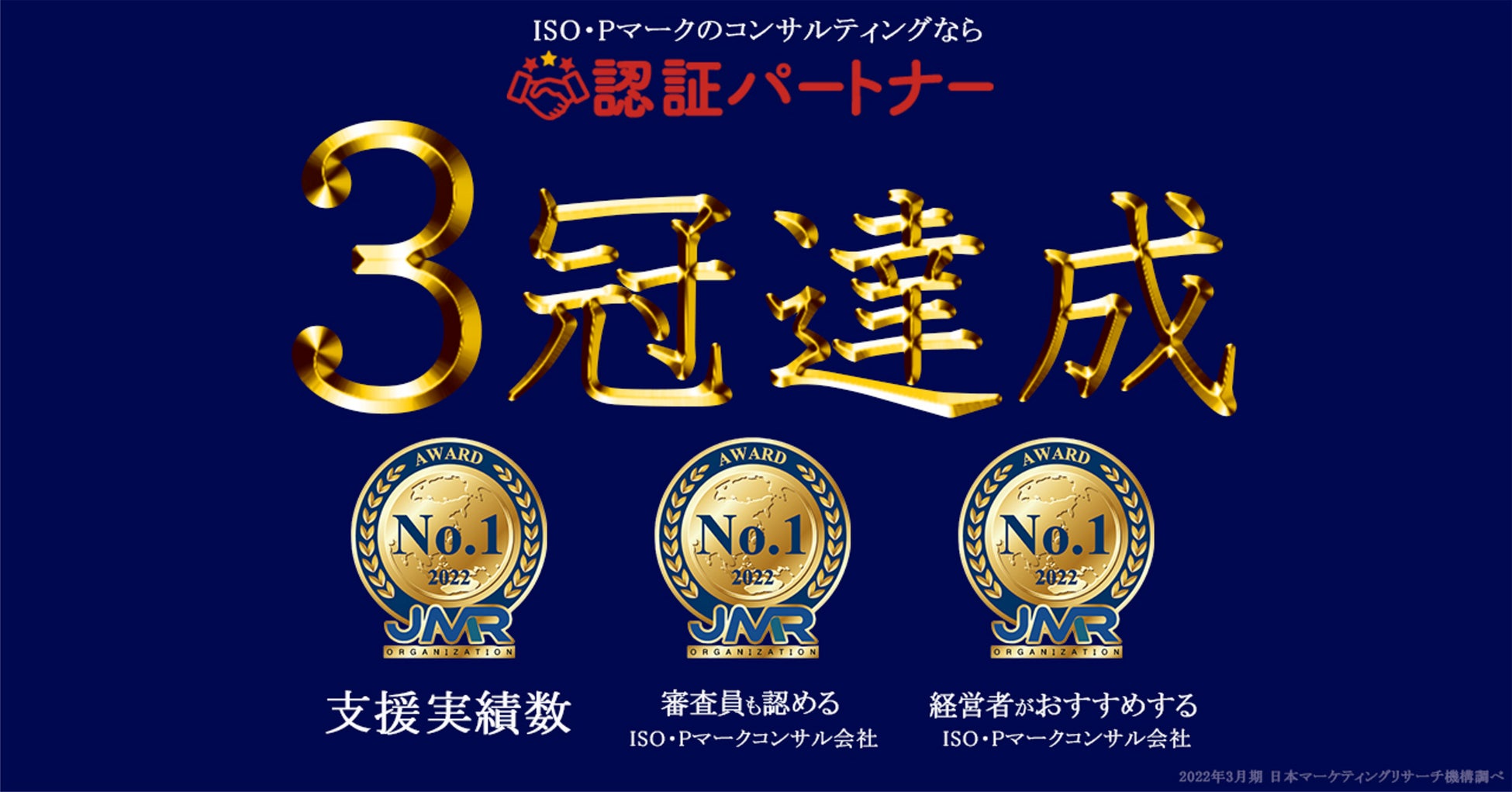 株式会社スリーエーコンサルティングが提供するISO/Pマークの取得・運用支援サービス『認証パートナー』が、このたび株式会社日本マーケティングリサーチ機構による市場調査において、「支援実績数 No.1」「審査員も認めるISO・Pマークコンサル会社 No.1」「経営者がおすすめするISO・Pマークコンサル会社 No.1」を獲得し、3冠を達成しました。