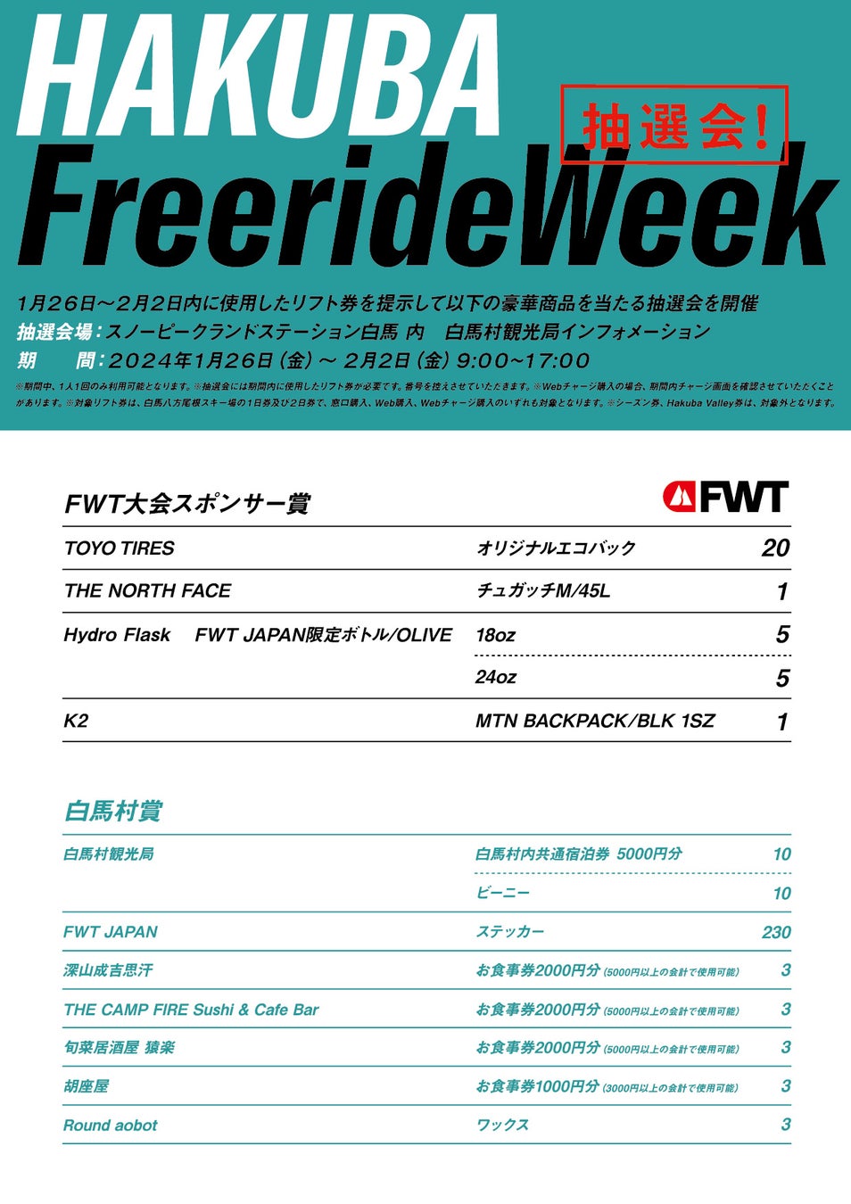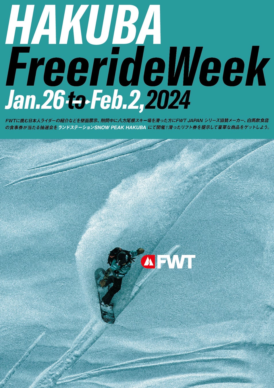 2024年1月26日(金)〜2月2日(金)の一週間を「HAKUBA Freeride Week」とし、スノーピークランドステーション白馬での抽選会や、FWTについての展示を行います。海外からの選手やインバウンド観光客の来日も見込まれます。年に一度のフリーライド大会期間に、ぜひ盛り上がる白馬へお越しください。