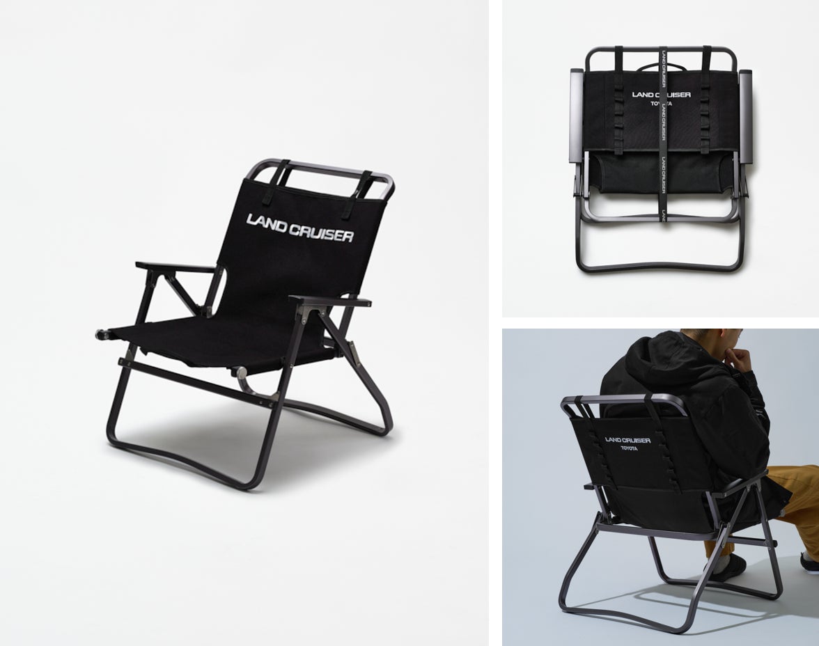 車へ積み込む際の上げ下ろしユースを想定し、チェアの開閉を結束バンドで固定することで作業性、ポータビリティを高めています。結束バンドはLAND CRUISERロゴが連続柄で印字され、収納時も特別感を醸し出してくれます。