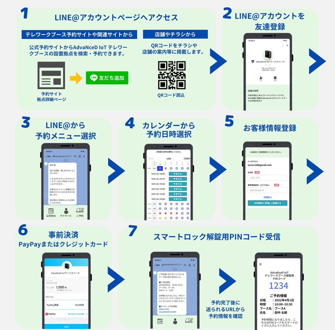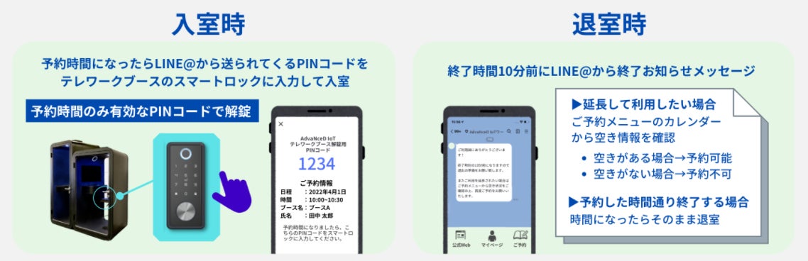 テレワークブースを利用するお客様はLINE@からテレワークブースの空き状況を把握して予約が可能になります。さらに事前決済機能や、予約時間のみ有効な解錠用PINコードで解錠できるスマートロックがセットになっているので、人手をかけずにテレワークブースの時間貸しビジネスの運営が可能です。