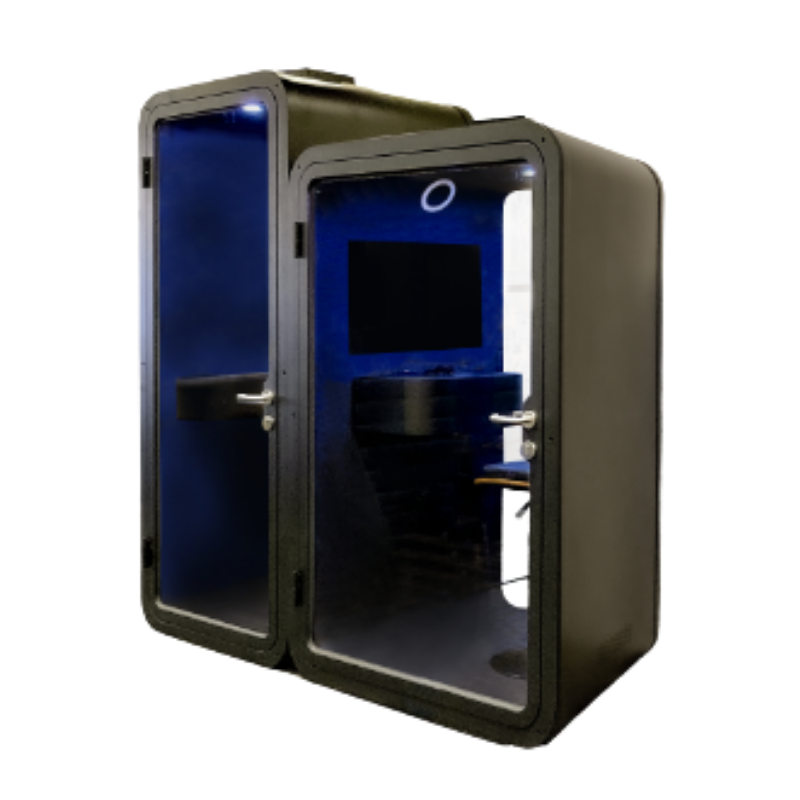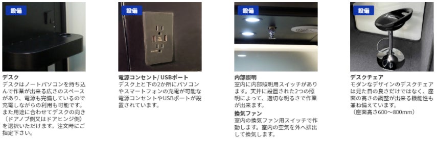 こちらは「テレワークブース」という遮音性のある個室型のブースです。ブース内からの音漏れを防ぎ、外部の騒音もシャットアウトします。照明やデスク、チェア等の設備があり、中で仕事が出来るのはもちろんのこと、遮音性能が高いので、Web会議用のブースとして沢山のお問い合わせをいただいています。