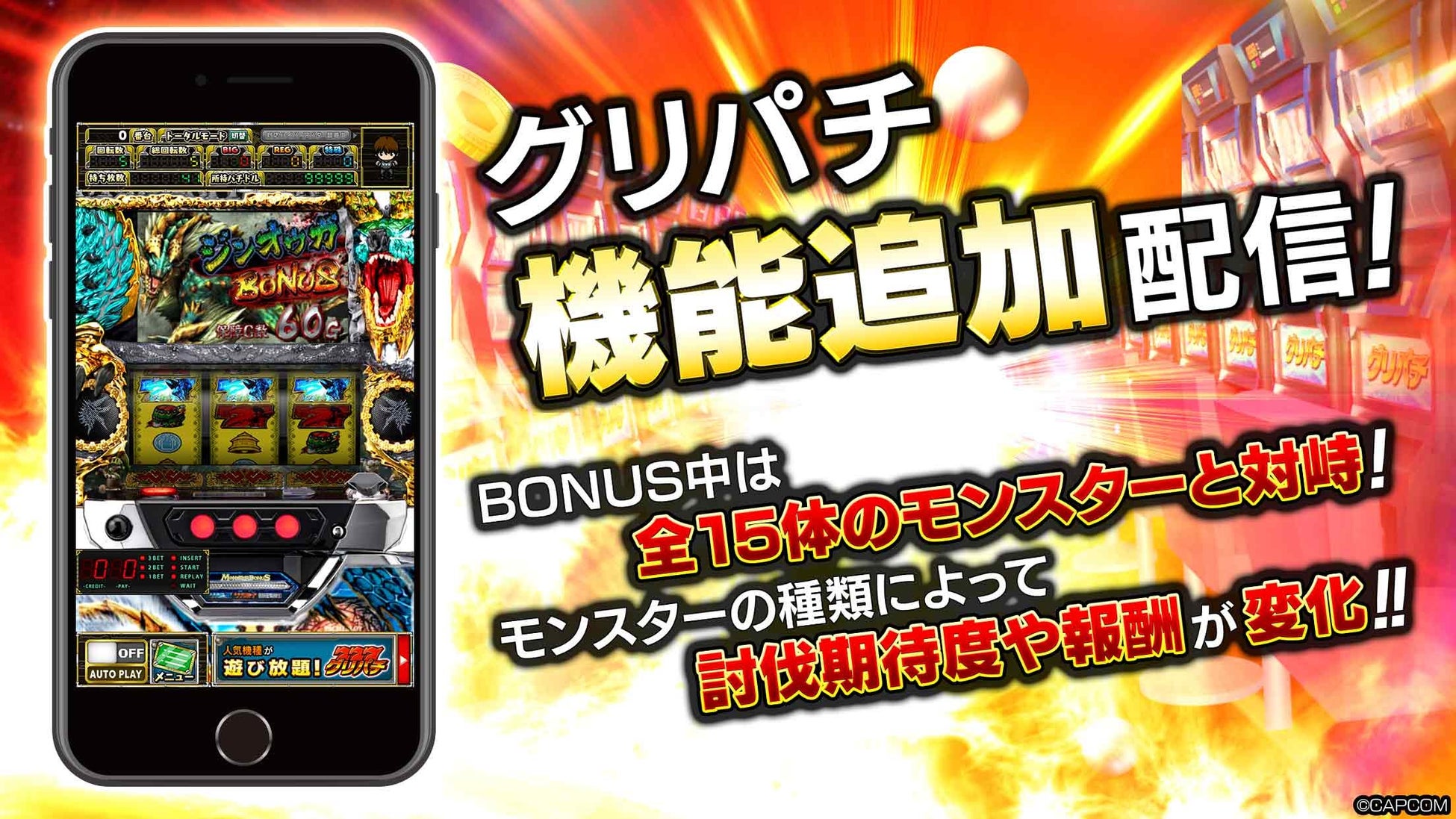 2014年(※)からグリパチ内にて好評配信中の機種アプリ『パチスロ モンスターハンター月下雷鳴』を、グリパチの様々なコンテンツ・機能に対応した機能追加版として新たに配信開始いたします。