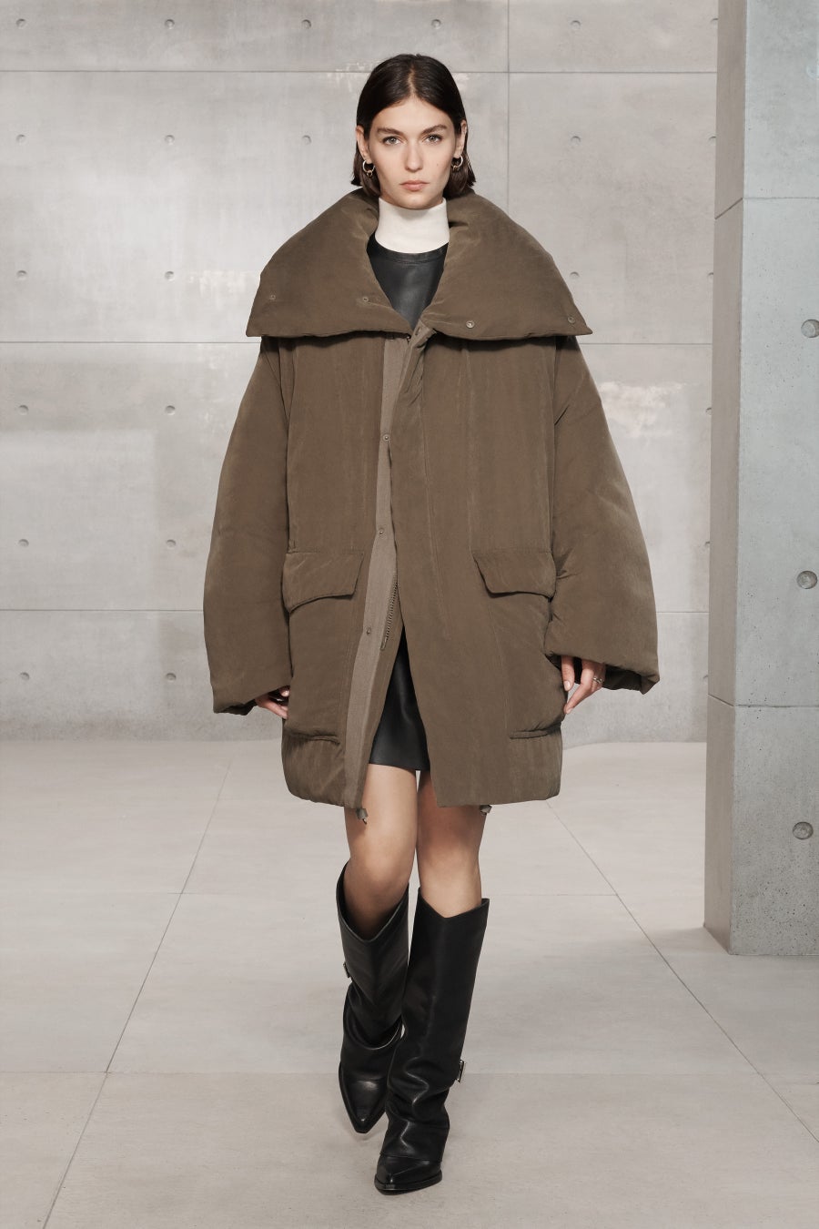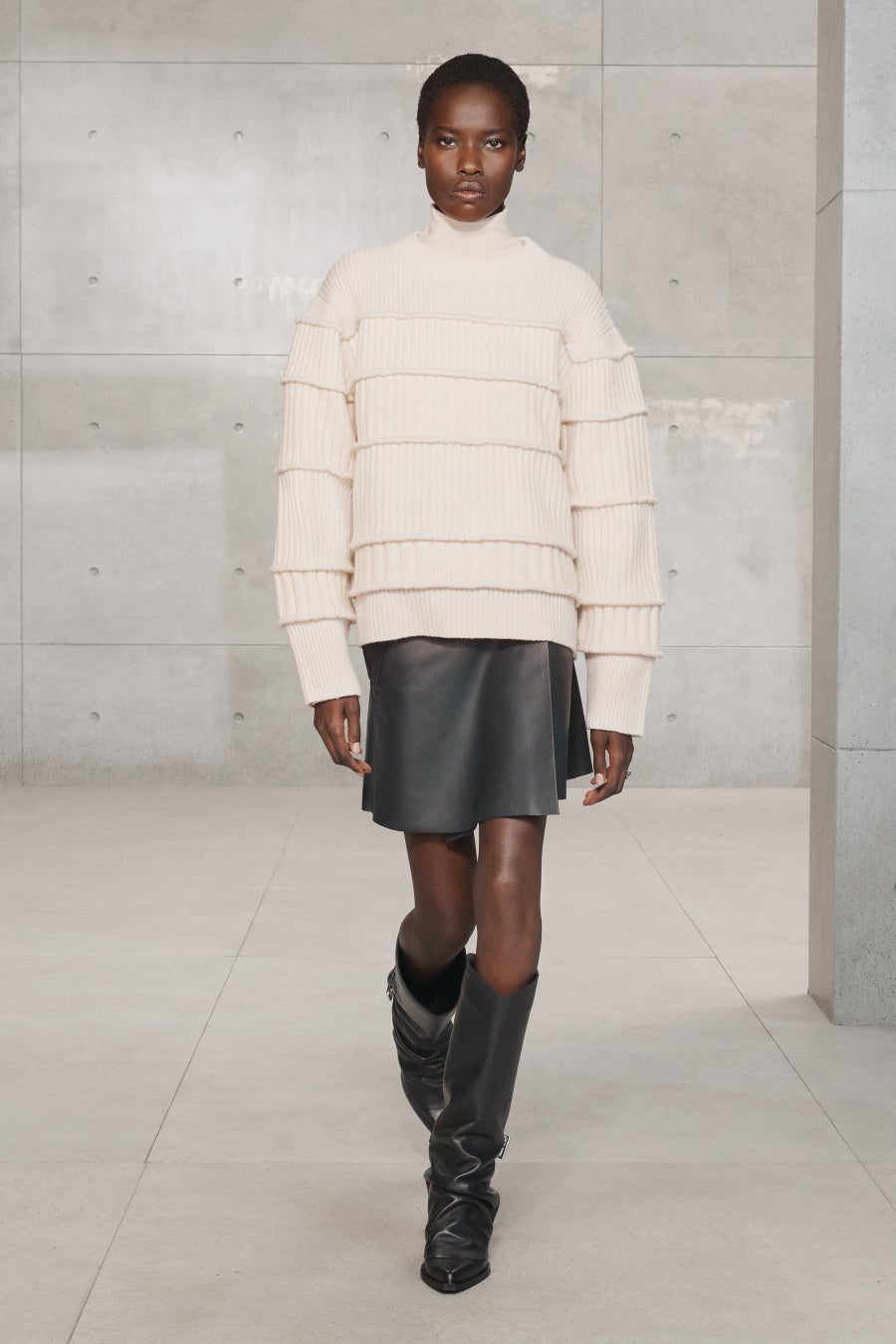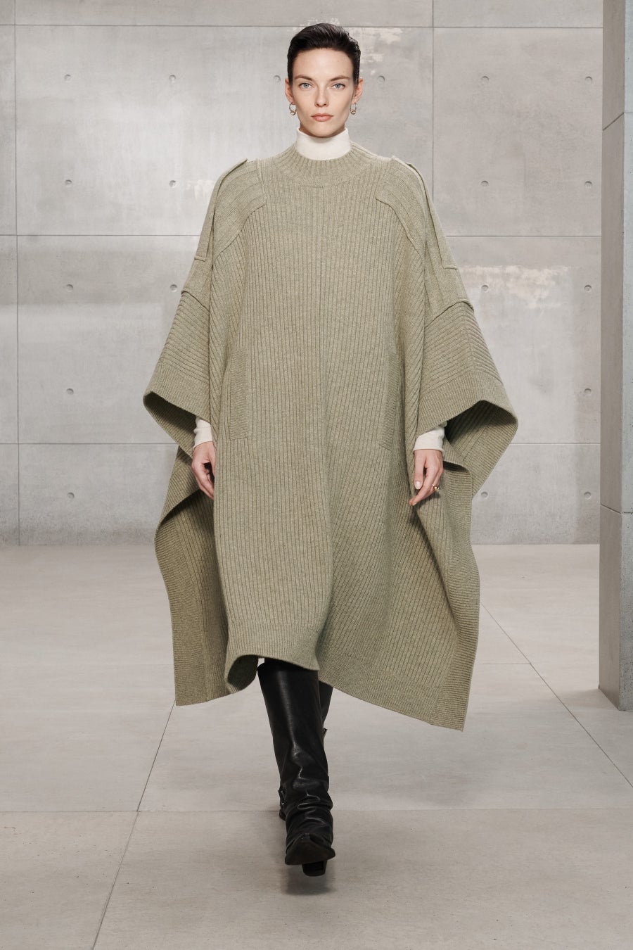 ソフトショルダースーツとウォッシュ加工のアウターウェアには、調整可能なDロックベルトが装着されています。スリーブの長さに掛けてボタンが配置されたシャツとシャツドレスは、フォームフィットのピースとレイヤードすることによって立体感を与えたルックになります。また、ハトメを使用したディテールによってリブニットの素材の柔らかさをより一層引き立てています。贅沢なボリューム感のあるポンチョには、海軍の潜水艦セーターから受け継がれた実用的なパッチディテールが施されています。細密な仕立てのテーラードパンツは、裾のボタンの開閉によってスリットディテールやドレープの着こなしが楽しめます。カーゴパンツを分解したパッチワーク加工のスカート、再解釈された大胆な真紅の色彩、そしてアビエイタージャンプスーツは、現代世界をナビゲートするためのユニフォームとして提案されています。現代的なモノカラーのボンバーは、オフホワイトでモダンに仕上げ、ショートパーカーはドラマチックに広がるフェイクファーでフード部分を装飾しています。ブラッシュ加工のレザーパンツは、ダブルベルトの構造が施されています。機能性があるジップ加工のアランニットを含め、ジェンダー問わず自由自在に適応するコレクションとして展開しています。