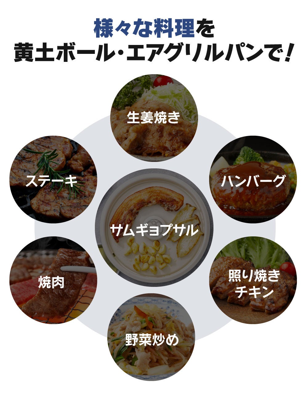 あなたがその時に食べたいお肉料理を自宅で簡単に黄土ボール・エアグリルパンで調理してください。