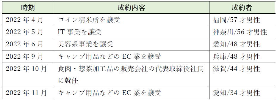 - 個別の案件探索支援、実際の譲渡案件へのエントリー添削、面談サポート