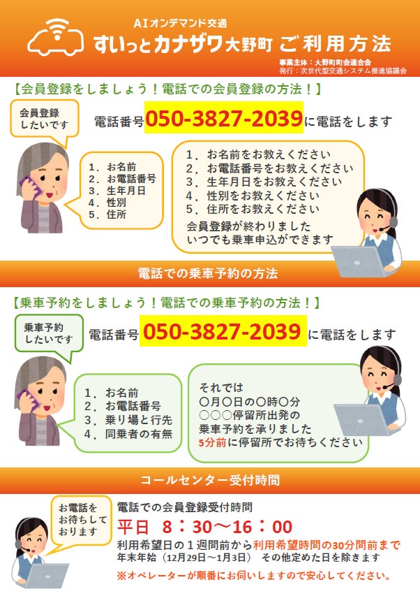 時代とともに地域交通を取り巻く環境が変化するなか、令和5年から大野町では金沢市と生活交通確保の必要性について勉強会を重ねてきました。この中で、地区内の住民の通院や買い物など日常生活に必要な生活交通の確保に向け協議を重ねた結果、路線バスを補完する交通手段として、地域運営交通(AI オンデマンド交通)の試験運行を開始することになりました。