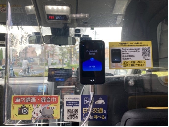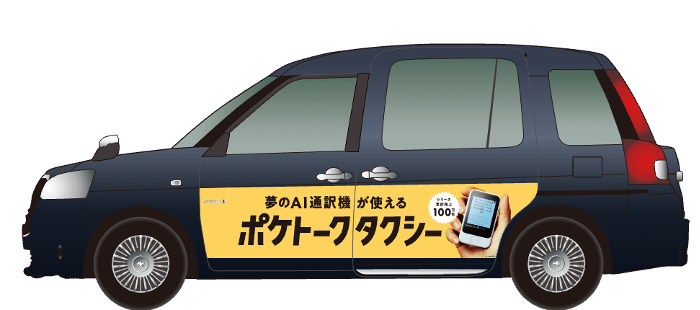 AI通訳機「ポケトーク」のサービスを搭載した、多言語対応タクシーです。対象車両にはAI通訳機「ポケトーク」端末が搭載され、ドライバーおよび乗客との間での多言語コミュニケーションを可能にします。