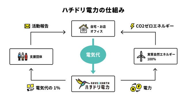 ハチドリ電力は、CO2ゼロの実質自然エネルギー100%プランのみを販売する電力サービスです。地球にやさしい電気だけでなく、社会問題に取り組むNPOやNGOに直接支援ができる仕組みを提供しています。