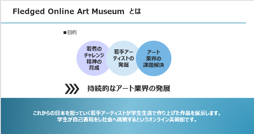 アート社会と周知され日常にアートの価値が評価されているが、若手アーティストの活動への課題はまだまだ多い。その解決策としてDX時代である現代だから可能であるオンラインミュージアムを設立します。
