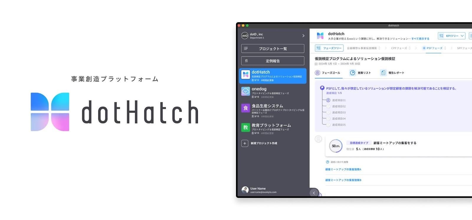 dotDが提供している「dotHatch」は、新規事業づくりを行う上で多くの企業が実現できていない「新規事業のフェーズ管理」「KPI管理」「効率的な業務管理」を適切に管理する事業創造プラットフォームです。事業づくりの各プロセスにおける、KPI設定や達成状況などを可視化し適切な管理を促すことで、業務の生産性を向上させ効率的な事業づくりを支援しています。