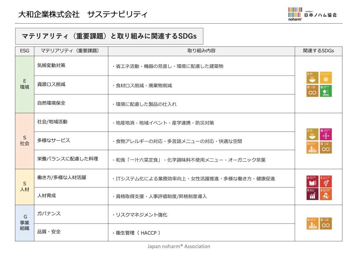 環境に配慮した製品の仕入れや栄養バランスを考えた料理など「料理・空間・サービス」におけるサステナブルな取り組みを推進する大和企業株式会社