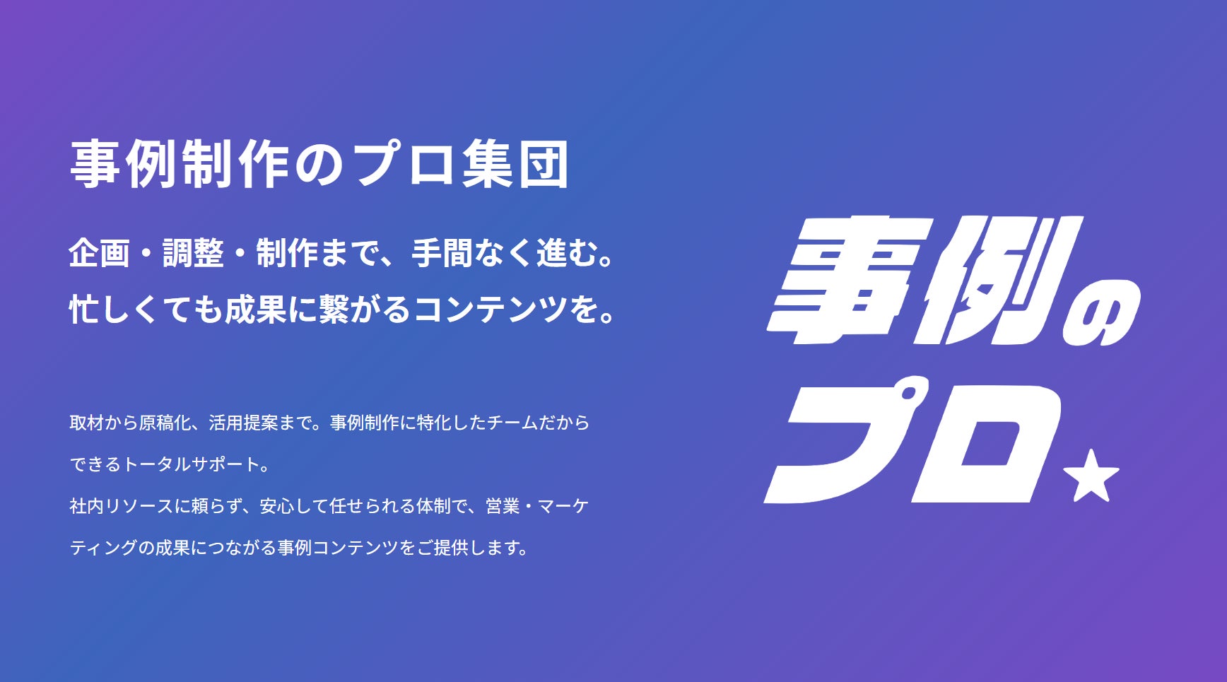事業内容:導入事例制作サービス「事例のプロ」、採用コンテンツ制作サービス「採用広報のプロ」の運営