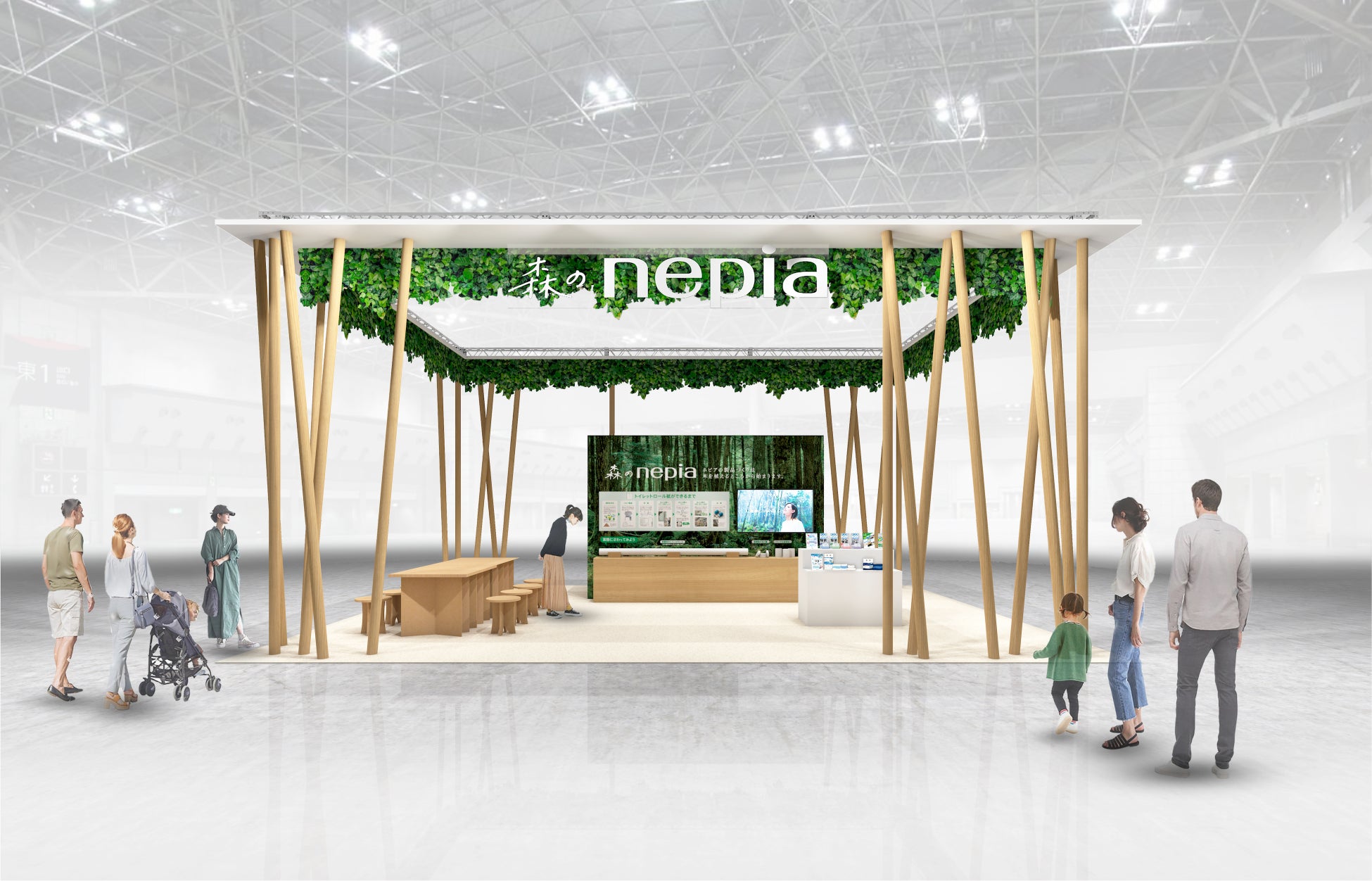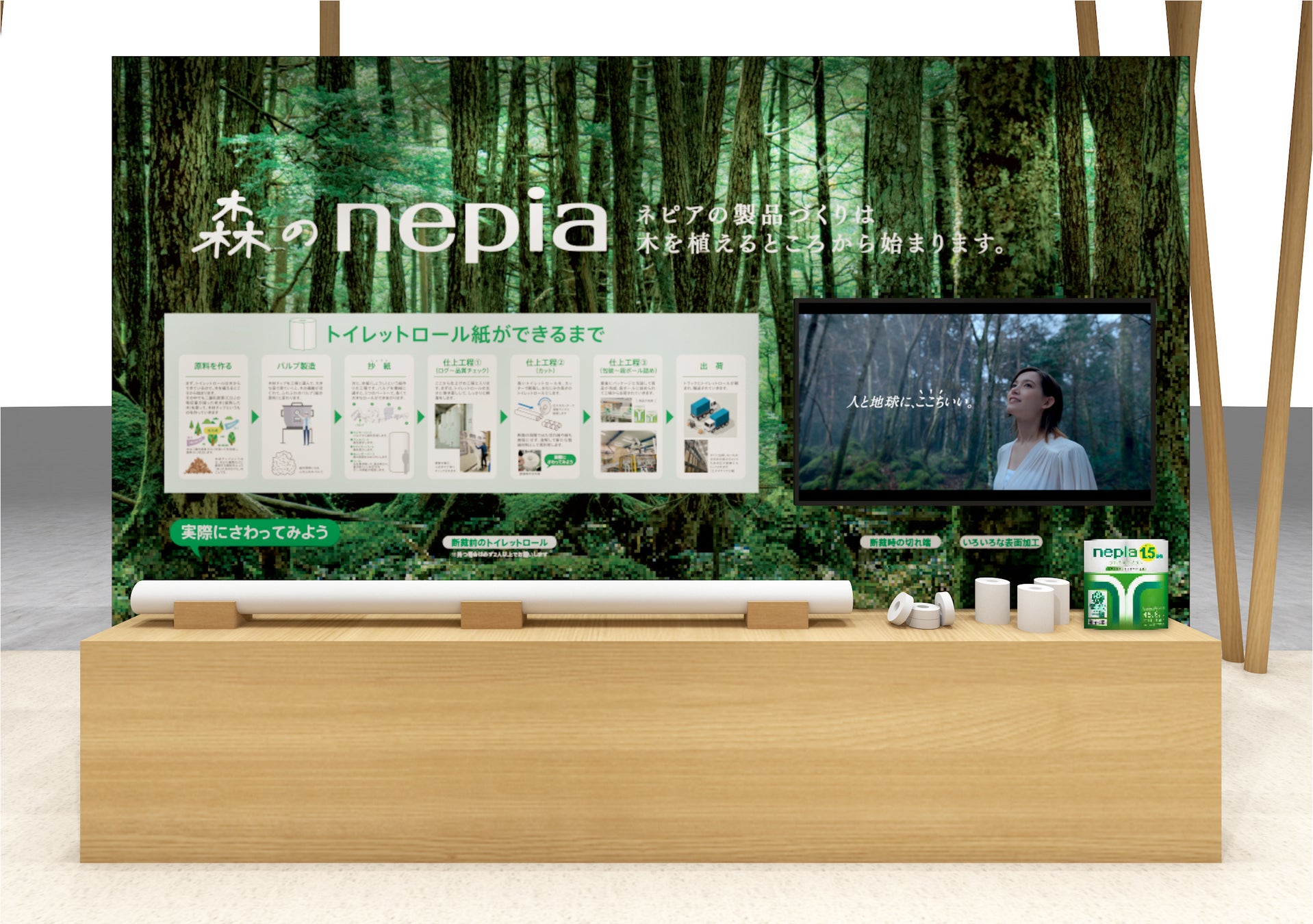 ネピアは「人と地球に、ここちいい。」のタグラインのもと、王子ホールディングスと共に森から環境を守る活動に取り組んでいます。今年度は「森のネピア」をコンセプトにしたブースとなっており、森や森から作られる紙の大切さをお子様にも知っていただけるよう、ティシュを使用してオリジナルのお花づくりを行うワークショップや、トイレットロールの生産工程について学べる工場動画の放映、断裁前の約2メートルを超える長いトイレットロールの展示を予定しています。