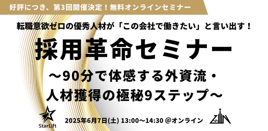 本セミナーでは、“採用はマーケティング”という視点から、転職意欲ゼロの優秀人材に「御社で働きたい」と言わせる“攻めの採用”戦略を90分で体感していただく。組織の成長を実現する優秀な人材との出会いの本質は、単なる「採用活動」ではなく、「マーケティング思考」にある。講師のStarLift株式会社 原代表が、過去の様々な挑戦と成功体験から得た、外資流・人材獲得の極秘9ステップを惜しみなく公開。「求人を出してもピンとこない人ばかり」「面接では良い人材に見えたのに、入社後すぐにギャップを感じる」そんなお悩みを抱える経営者の皆さま必聴である。先着10名限定となっているため、ご興味のある方はお早めにお申し込みいただきたい。
