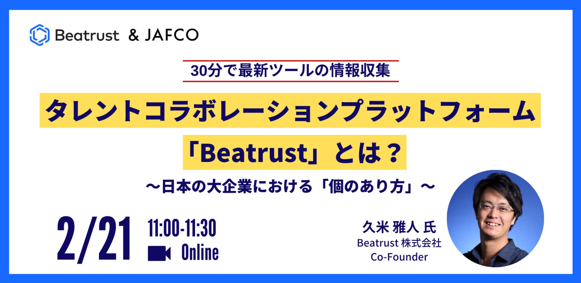 同サービスを通じて生まれた従業員同士の繋がりが、結果的に導入企業へどの様な効果をもたらしたのかといった事例や、従来のタレントマネジメントシステムとの違いなどについて、弊社( https://corp.beatrust.com/ )の共同創業者である久米よりお話しさせていただきます。