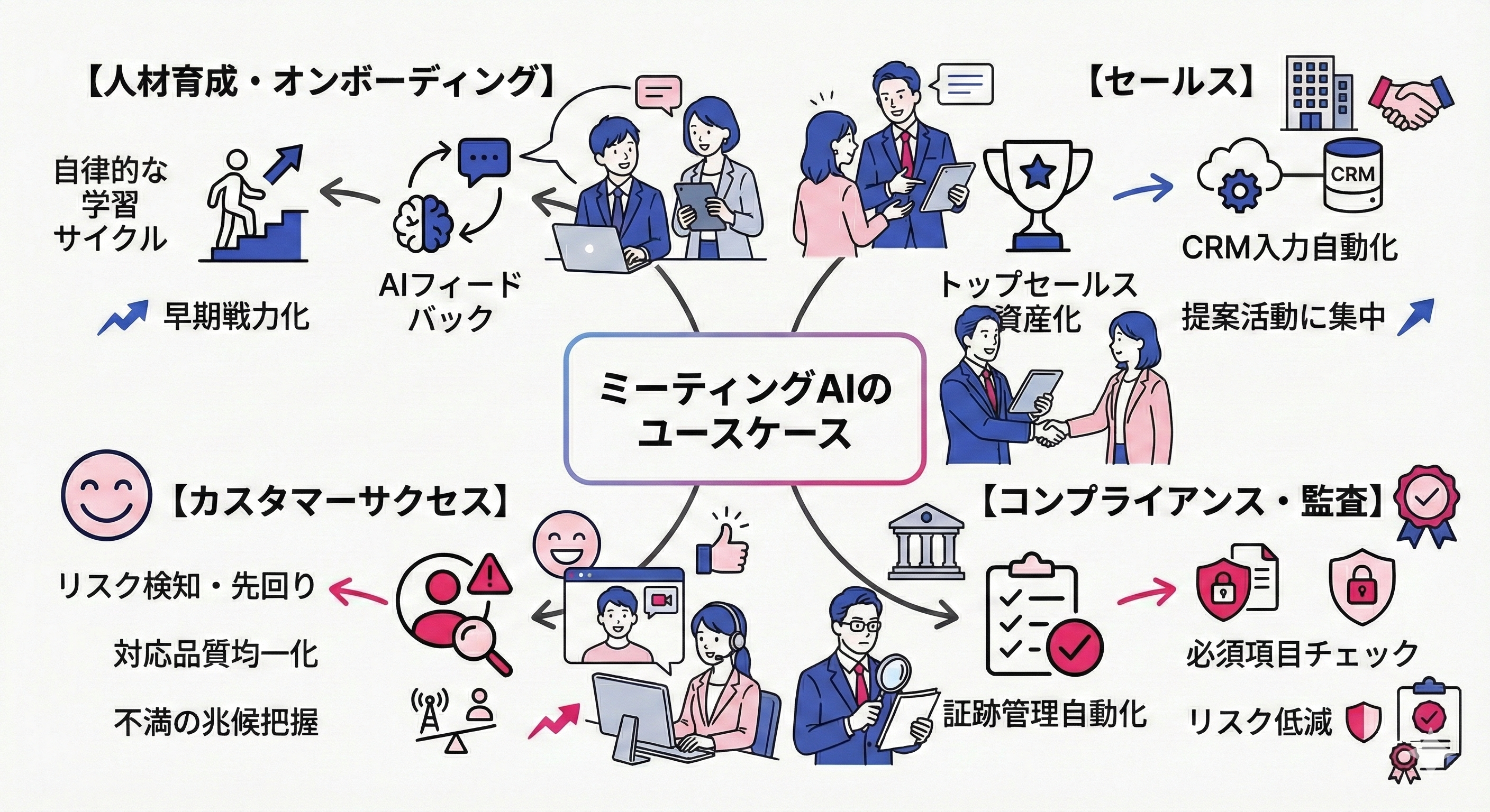 ミーティングAIは、会議という“現場の一次情報”を自動で記録・整理し、育成・評価・コンプライアンスの課題解決に活用できる基盤を提供します。