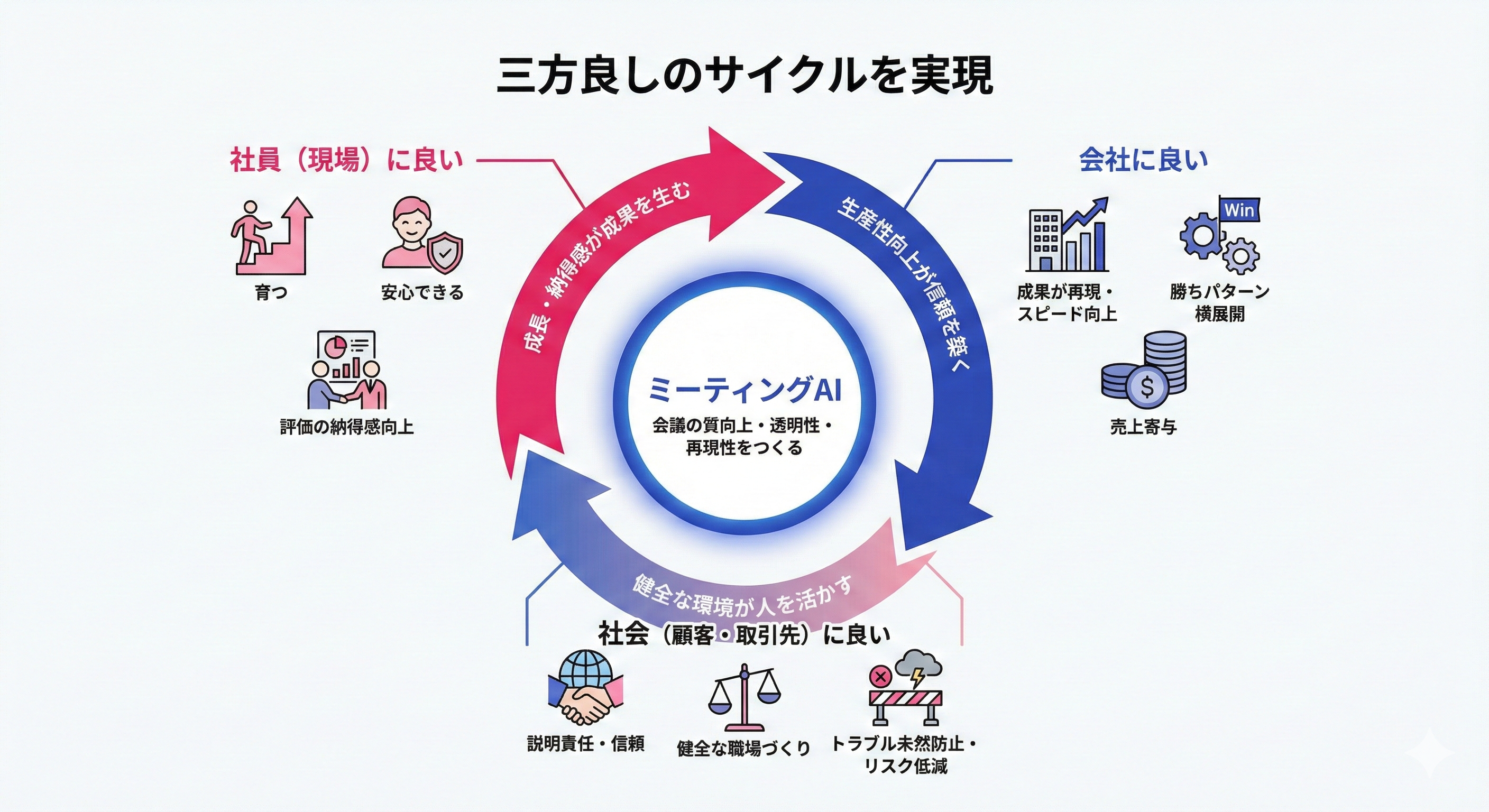 ミーティングAIが目指すのは、「会議を監視する」ことではなく、会議の質を上げ、透明性と再現性をつくることです。これにより、次の“良い循環”が生まれます。