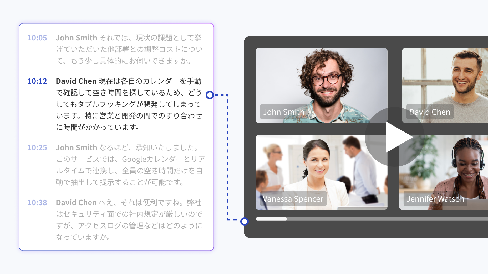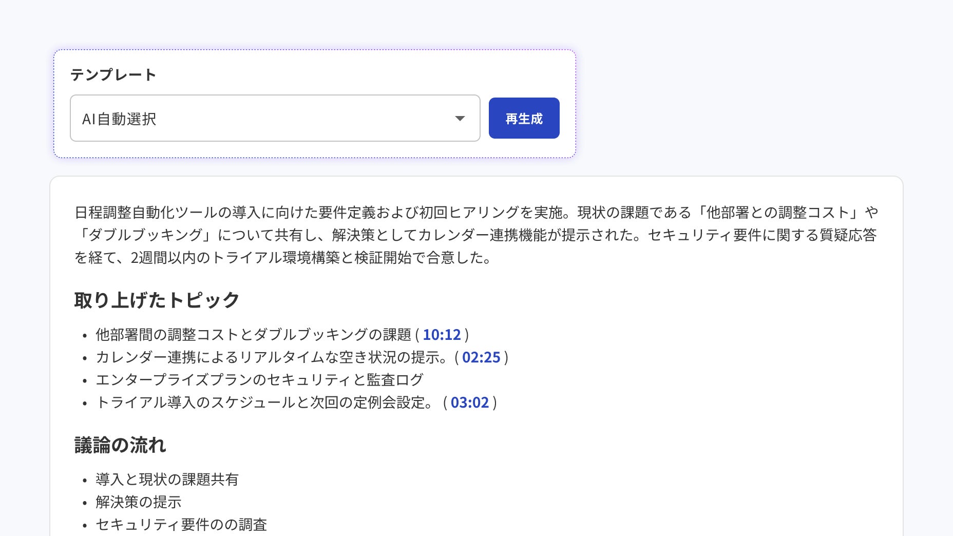 日程調整を起点に、録画・文字起こし・要点整理・分析・CRM連携まで自動化。会議を「やりっぱなし」にせず、組織のナレッジとして継続的にかつ自動的に蓄積・活用できる状態をつくります。