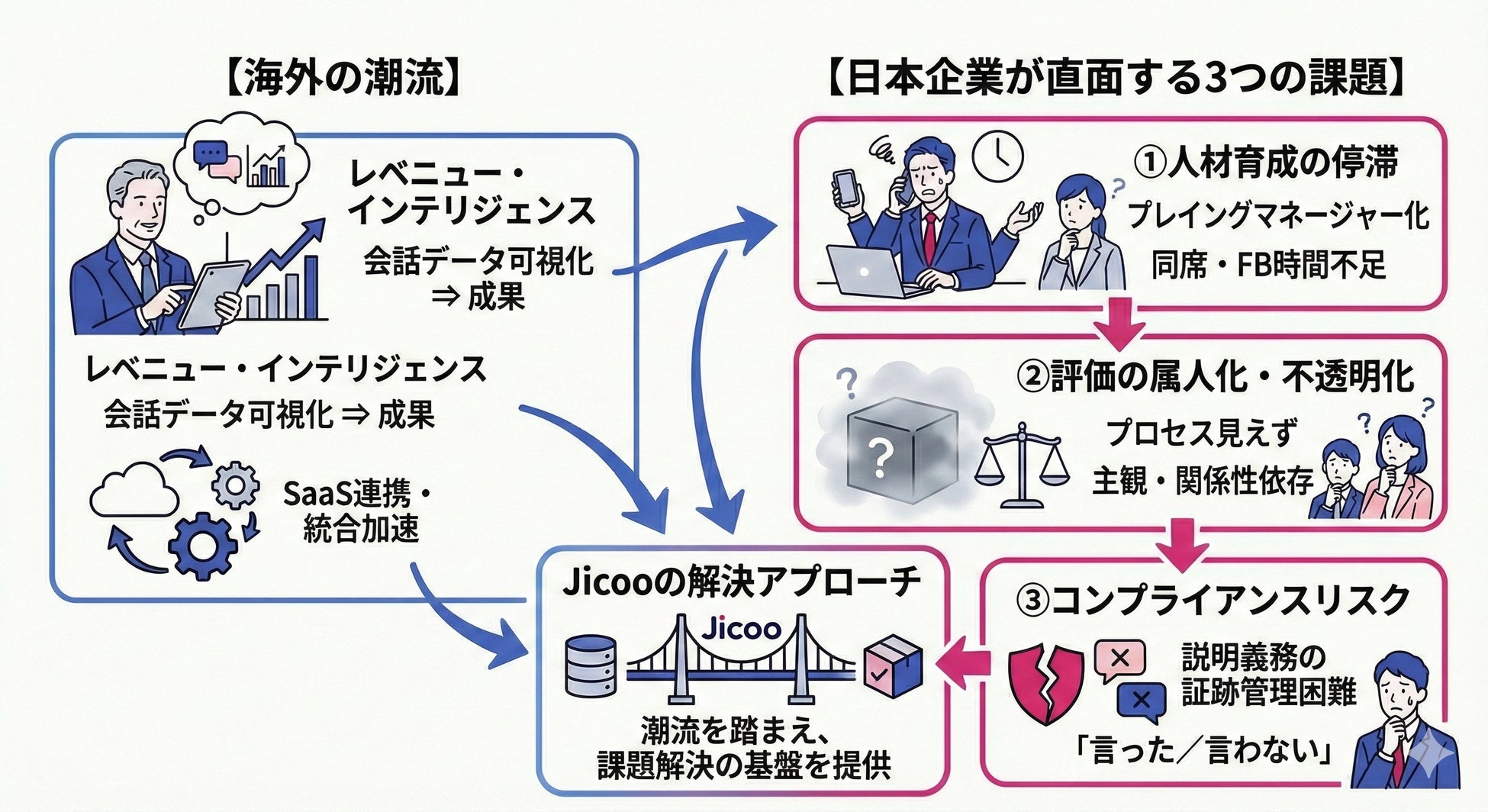 北米を中心に、商談や面談などの会話データを可視化して成果につなげる「レベニュー・インテリジェンス(Revenue Intelligence)」や、複数SaaSを連携・統合して運用する流れが加速しています。Jicooはこの潮流を踏まえ、「ビジネス向け日程調整」を起点に、会議前後の業務までを一気通貫で自動化することを目指してきました。