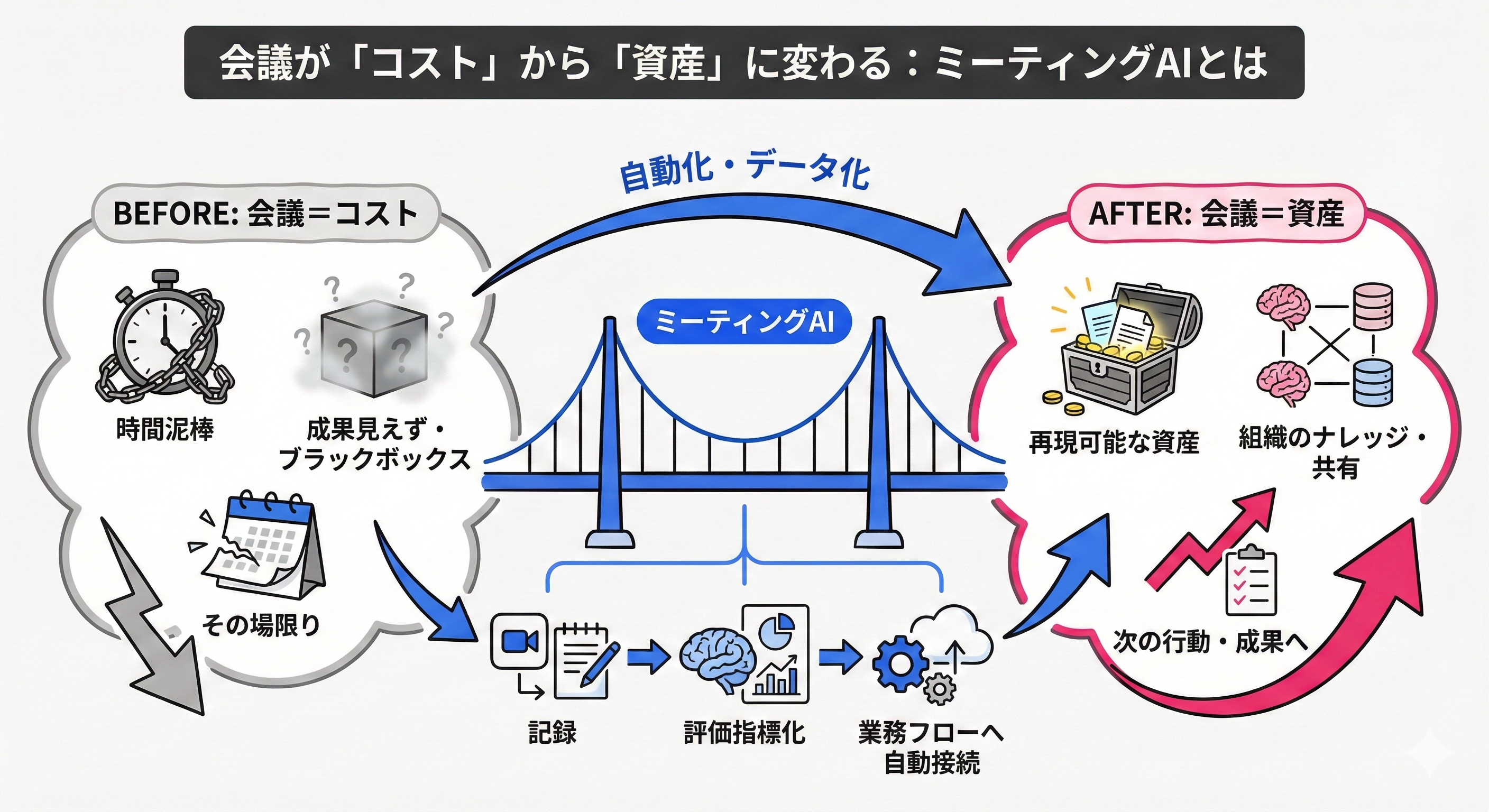 会議を「その場限り」のイベントではなく、組織の成果をつくる再現可能な資産に変える——それが本機能の狙いです。