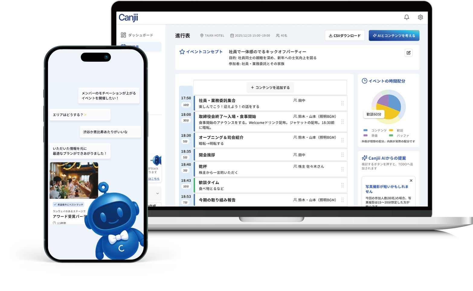 「Canjii」は、AIイベントプランナーが社内イベントの会場探し・企画・準備の効率化をサポートする幹事向けサービスです。多くのイベント幹事様を悩ませる、予算や参加人数に合致する会場探し・イベントコンテンツの発案・進行管理表の作成を「Canjii」がサポート。通常業務と並行するには手一杯な幹事様も「Canjii」と一緒に準備をすれば、チームの勢いを加速させるすてきなイベントが開催できます。