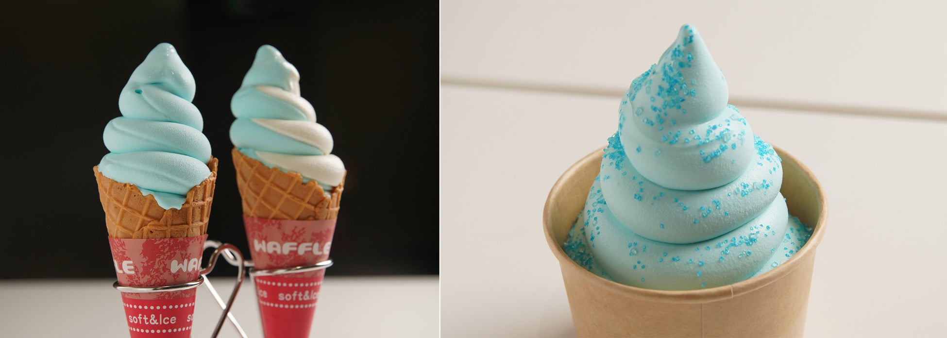 ブルー&ブルーソーダフロート以外にも、ラムネソフト/ミックスソフト/ラムネサンデーでも青色のデザートをお楽しみいただけます。