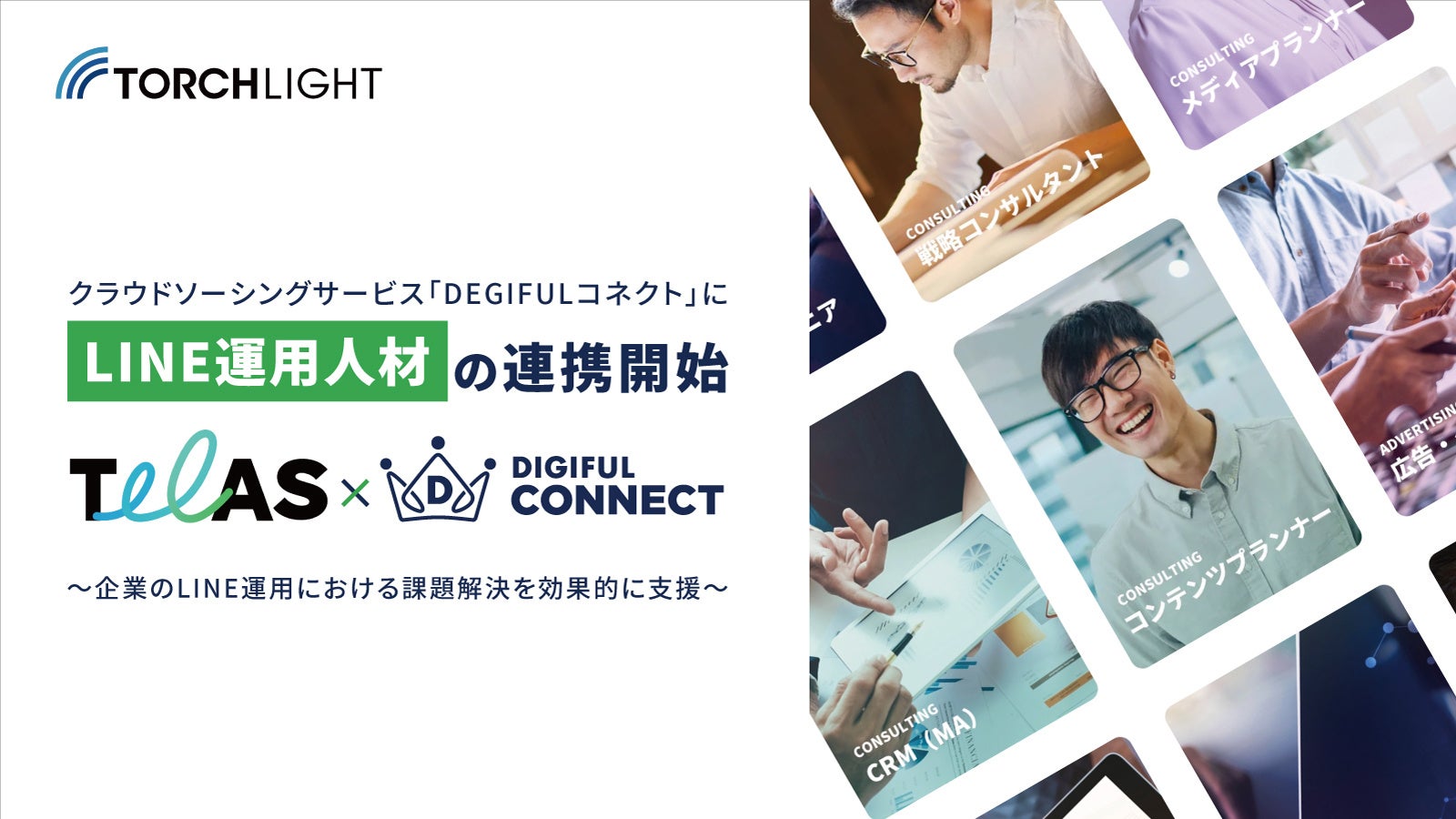 株式会社トーチライト(本社:東京都渋谷区、代表取締役社長:熊田 聡、以下 トーチライト)は、当社が提供するLINE運用トータルサポートサービス「TeLAS(テラス)」※1と株式会社Hakuhodo DY ONE(所在地:東京都港区、代表取締役会長:田中雄三 代表取締役社長:小坂洋人、以下 Hakuhodo DY ONE)が運営するクラウドソーシングサービス「DIGIFULコネクト」※2の連携を開始しました。これにより、LINE公式アカウント運用に特化したプロフェッショナル人材の提供を通じて、企業のLINE公式アカウント運用に関する課題の解決を、より専門的かつ効果的に支援することを目指します。