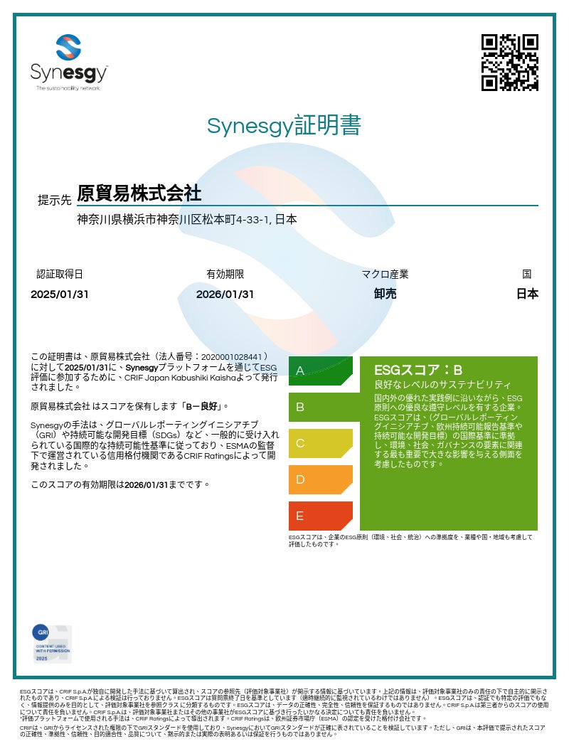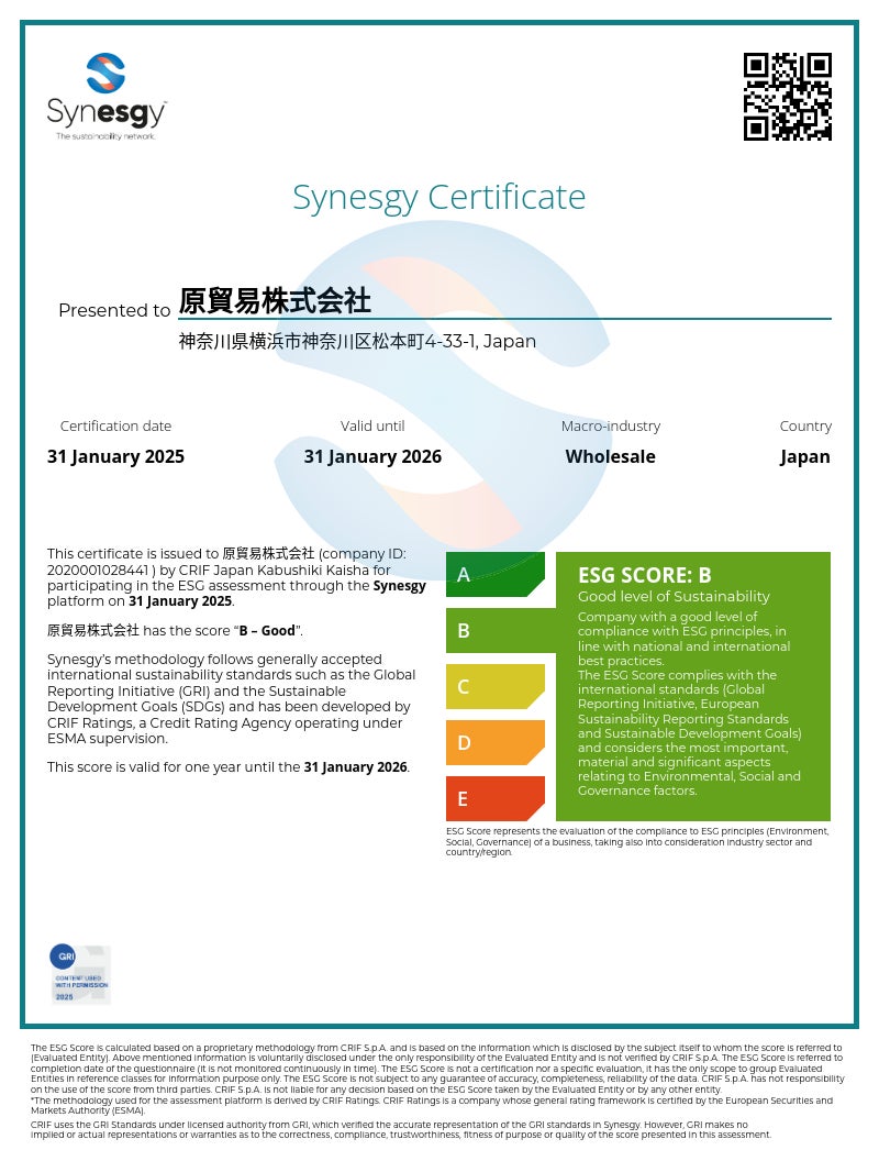原貿易株式会社(本社:神奈川県横浜市、代表取締役:江守雅人)は、CRIF S.p.A(本社:イタリア ボローニャ、会長兼CEO:カルロ・ゲラルディ)の日本法人CRIF Japan株式会社(本社:東京都千代田区、代表取締役:ビンチェンツォ・レスタ)が提供するESG評価サービス「Synesgy」により、評価を取得したことをお知らせ致します。