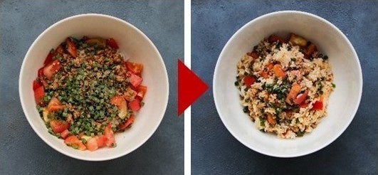 器にごはんを盛り、その上にお好みの食材と調味料をのせて、スプーンでよく混ぜて食します。