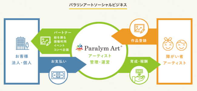 パラリンアートは「障がい者がアートで夢を叶える世界」の実現を目指し、社会保障費に依存せず、民間企業と個人の協力で障がい者支援を継続できる社会貢献型事業を行っています。障がい者の多くは、社会参加への周囲の理解の少なさや、金銭的困窮などの課題を抱えており、これらの課題を解決するための仕組みは依然として不足しているのが現状です。パラリンアートは、障がい者アーティストの作品(絵画・デザイン等)をさまざまな企業・団体にアート利用してもらうための橋渡しの役割を担い、障がい者が持つ才能をひろく世間に発信するとともに、採用されたアーティストや障がい者施設へ報酬を支払うことで、彼らの社会参加と経済的自立を推進しています。