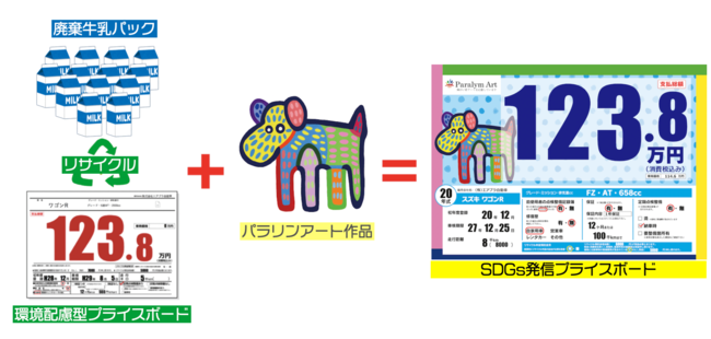 自動車公正競争規約改正に伴い、中古車の「支払総額」表示義務化が2023年10月に施行されます。それに合わせてプライスボードの項目内容において規約改正に合わせた適切な表記が求められます。それを見据えて規約改正に対応したプライス作成システム「エアプラ」のプロモーション展開のため、地球環境に優しい牛乳パックでつくられたプライスボード(ミルクパネル)をトライアル申し込みいただいた販売代理店に提供されます。プライスボードのデザインにはパラリンアート作品を採用いただき、環境保護とSDGsを意識した自動車業界では初の取り組み※となります。