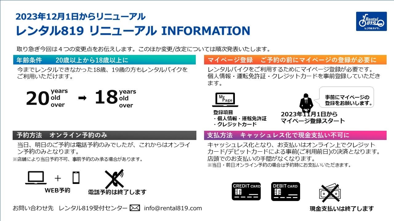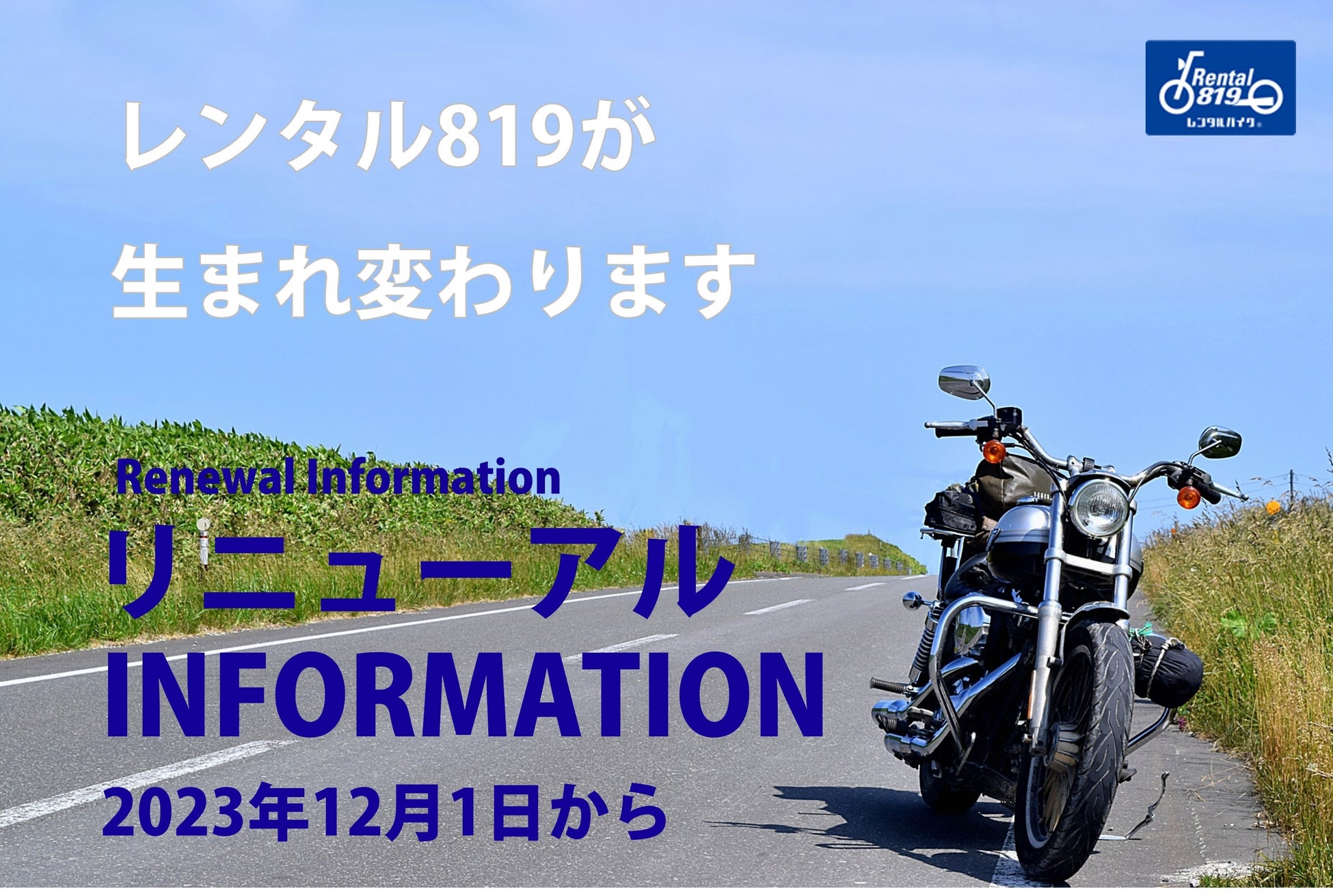 全国で原付き~大型バイクや電動バイクまでのレンタルバイクサービスを展開する「レンタル819」のWebサイトが、2023年12月1日より全面リニューアルいたします。リニューアルすることで、お客様にはより便利で簡単に、レンタルバイクをご利用いただける、新しいがたくさんのレンタル819となります!