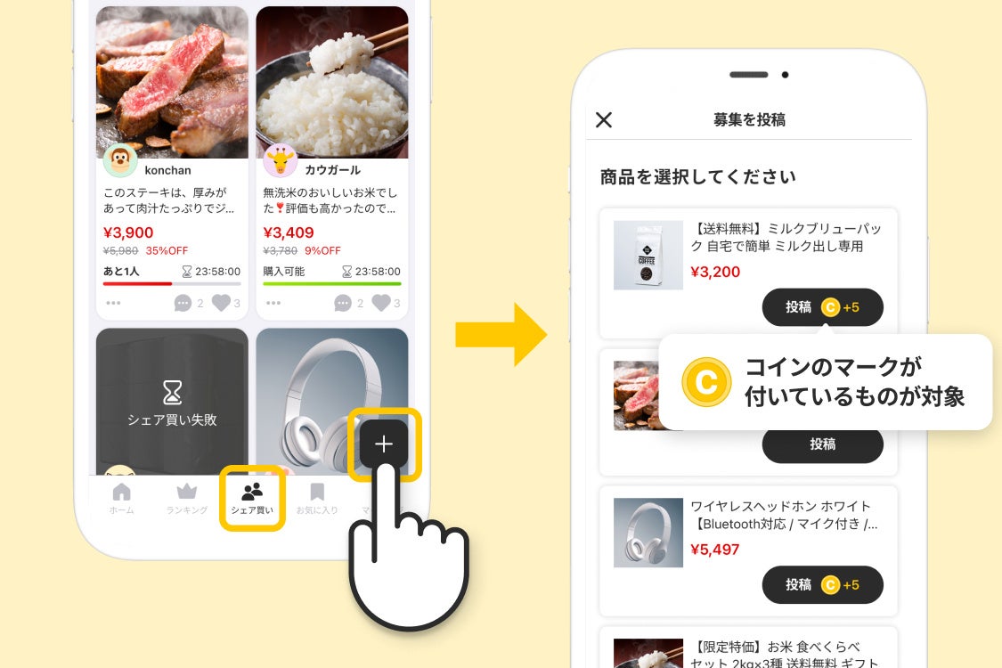 「カウシェ」は、友人や家族、またはSNS上の誰かと一緒に商品を購入することで、お得になる「シェア買いアプリ」です。