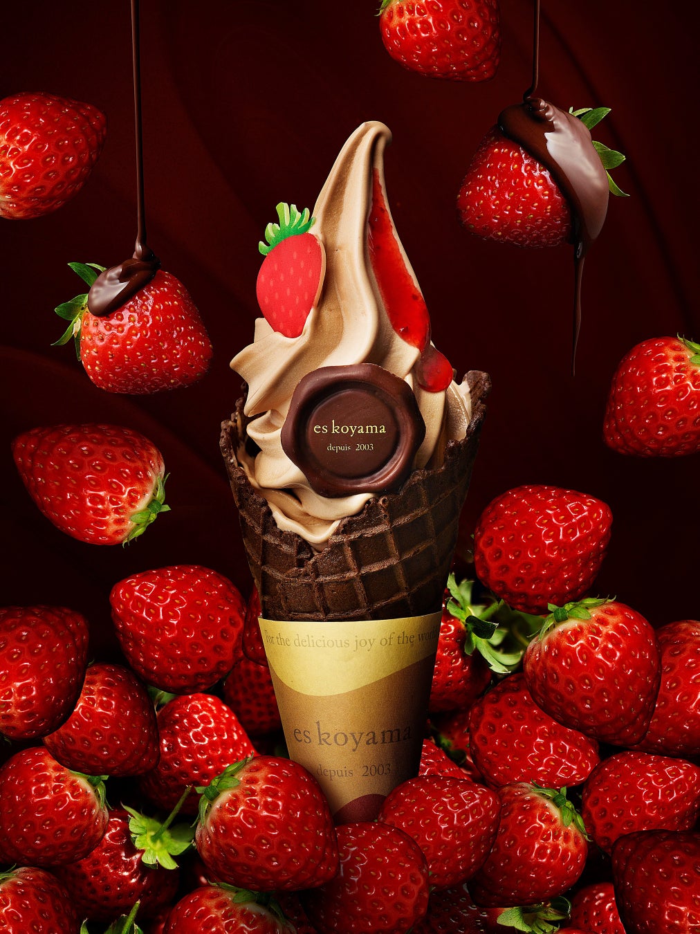 仕上げに愛らしい苺とes koyamaブランドエンブレムのチョコレートをデコレート。