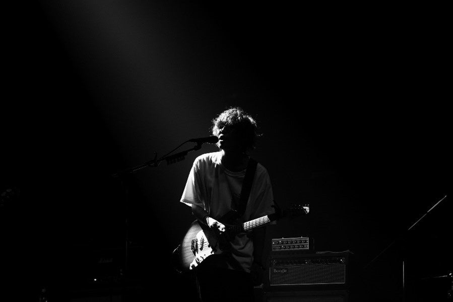 1曲目「脱衣麻雀」からJohn Natsuki(Dr)が叩くパッドのビートがずしんと会場に響き、サイケデリックで摩訶不思議なTempalayの世界へと一気に誘い込む。途中で、小原綾斗(Vo,Gt)が左手でお札を数えるような仕草を見せた瞬間がステージ隣のスクリーンに映る。音も、言葉も、パフォーマンスも、ファッションも、隅々にまでユーモアを散りばめるTempalayらしい。この日、小原いわく「喉の調子が悪い」とのことで、最後の曲「そなちね」では何度か言葉を詰まらす場面も。この曲はJohn Natsukiの子どもが生まれるときに書かれたものであるが、そんな小原の今日の歌い方が、親が子どもに想うどんな言葉にもならないような、親が命がけになってでも、子が美しい光のように生きていくことを切実に願う気持ちが表現されているかのようだった。