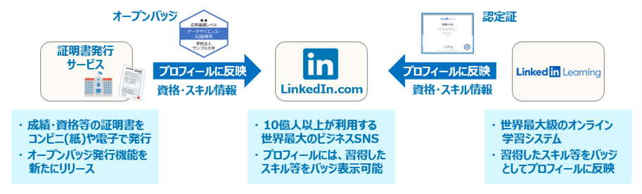 認定スキルの情報を証明書発行サービスへ取り込むことで、学生は同サービスを使って、コンビニでの証明書印刷、企業への電子ファイルとしてのオンライン送付、およびオープンバッジ発行が可能となります。また、オープンバッジを、LinkedIn.com と連携することで、世界へ発信できます。京都先端科学大学では、工学部の新入