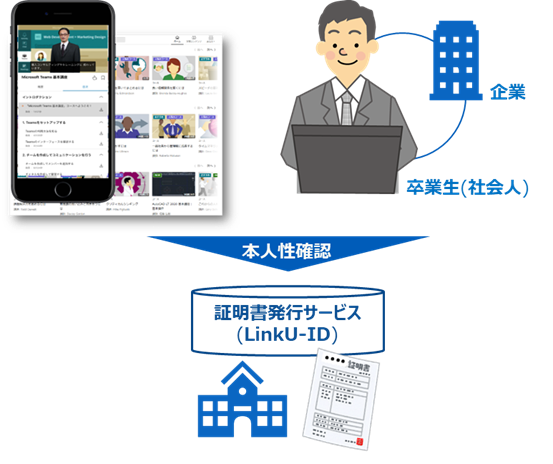 証明書発行サービスが持つ「LinkU-ID」認証サービスの最大の特徴は、ここで認証をすることでその大学の卒業生であることを保証(卒業生本人性確認)できる点です。LinkedIn ラーニングを同サービスで 認証させることにより、京都先端科学大学は、在学生と同じ条件(履歴の保持・アカデミック価格)で、 LinkedIn ラーニングを卒業生へ提供することが可能となります。これまで企業のニーズに応えてきた京都先端科学大学が、卒業生に対してこの仕組みを用いることで、同大学を卒業したメリットをもたらすとともに、実践力の向上・リスキリングを支援します。
