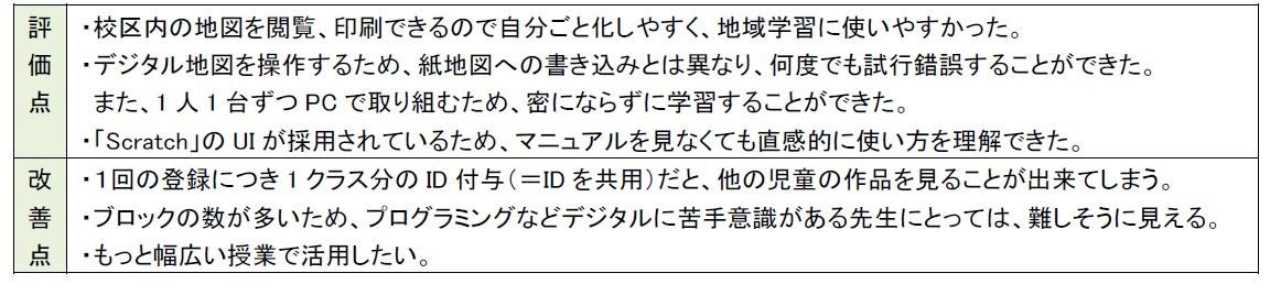 2021年3月22日(月)の「まなっぷ」提供開始後、実際に小学校の先生・児童のみなさんにご利用いただき、ヒアリングを行ってきました。様々な単元で活用いただいたほか、地図上でプログラミング学習ができることについて評価いただきました。また、いただいた改善点は今回の新商品に反映されています。