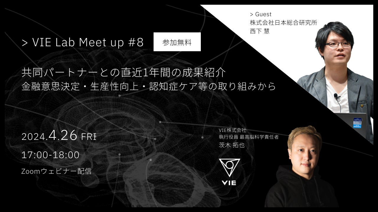 次世代型ウェアラブル脳波計の開発とニューロテクノロジーの社会実装を行うVIE株式会社は、法人・研究機関の研究者・事業開発担当者向けに、脳神経科学の社会実装に向けて各種産業・研究領域とのパートナーシップを強化するイベント「VIE Lab Meet up」を定期開催しています。