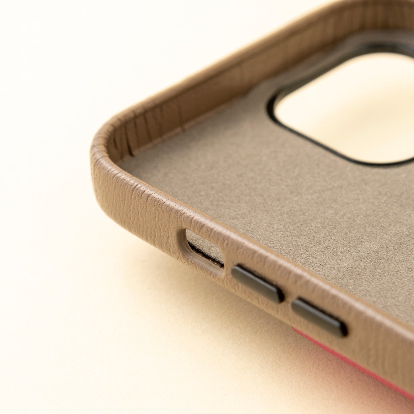 また、本モデルでは、Made In ItalyにこだわるL’arcobalenoだからこそ叶えられる熟練された職人技が存分に活かされています。iPhoneケースの縁部分(液晶画面周り)はコバ仕上げが用いられることが通例とされていますが、高頻度で使用するiPhoneケースの場合コバが剥がれてくる危険を有します。その危険を回避するため、本モデルではレザーをiPhoneケースの内側に巻き込みコバを使用せずに仕上げています。