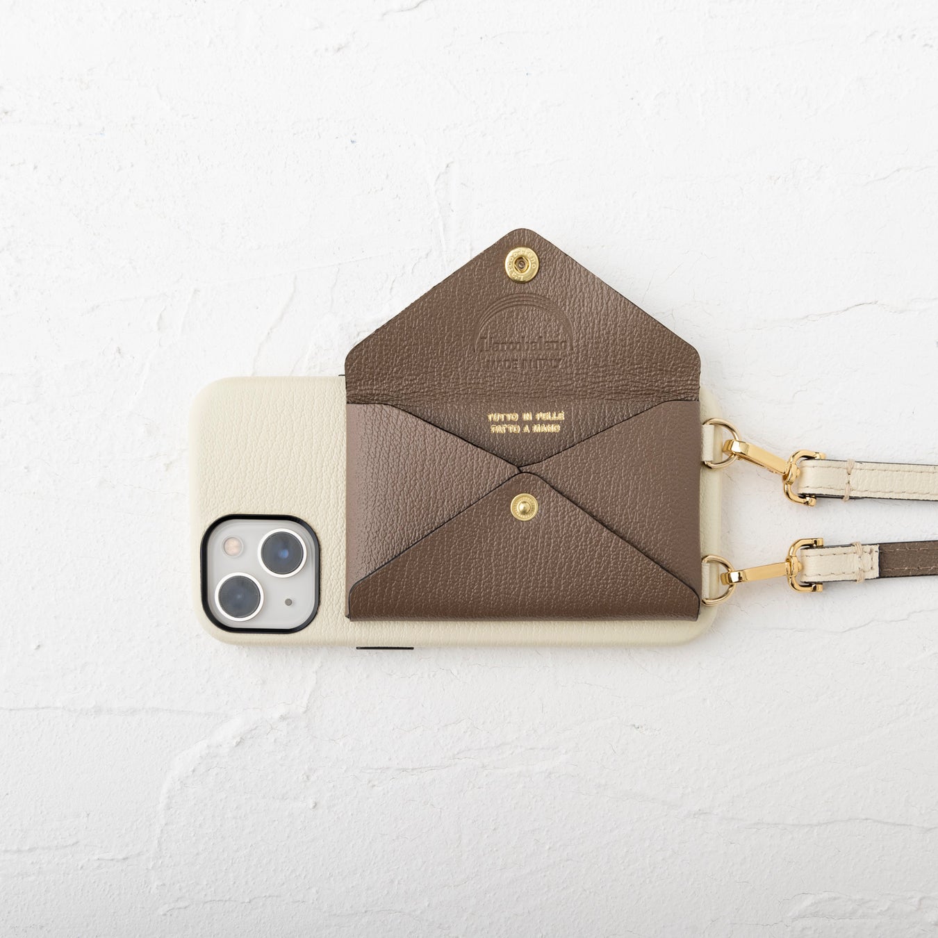 「ショルダーストラップ付バックカバーiPhoneケース」は以前から発売されている「バックカバーiPhoneケース」と同様、背面のエンベロップデザインが特徴。エンベロップには使用頻度の高いICカードや名刺、クレジットカードなどを収納することができ、目を引くデザイン性だけではなく、昨今のライフスタイルに合う実用性も兼ね備えています。