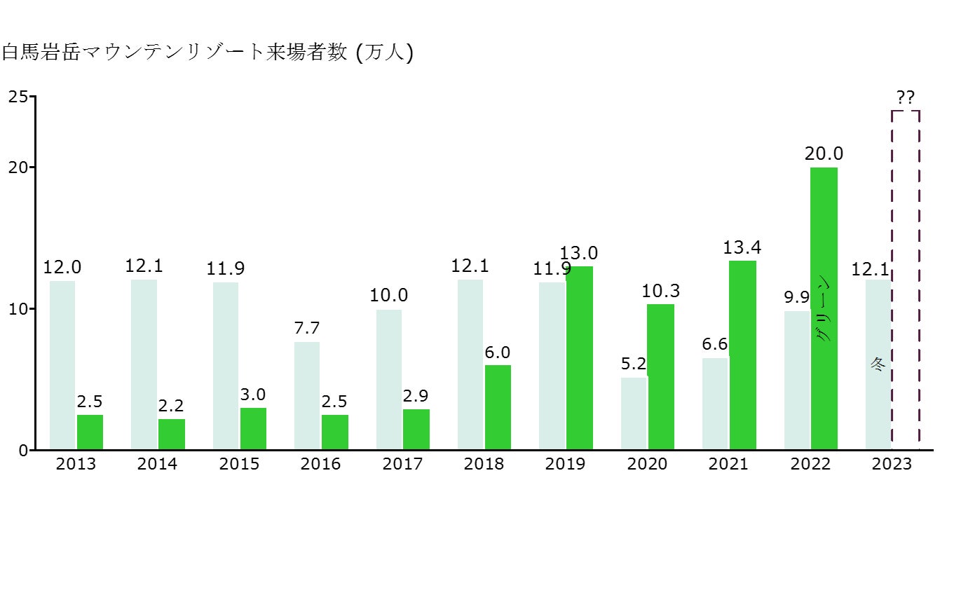 その結果、2022年グリーンシーズン(2022年4月28⽇〜11⽉13⽇)においてはコロナ禍にも関わらず過去最高の約20万人のお客様にご来場いただき、ウィンターシーズンの来場者数を大きく上回る、「冬よりも夏(グリーンシーズン)に多くのお客様が来場するスキー場」に進化しています。