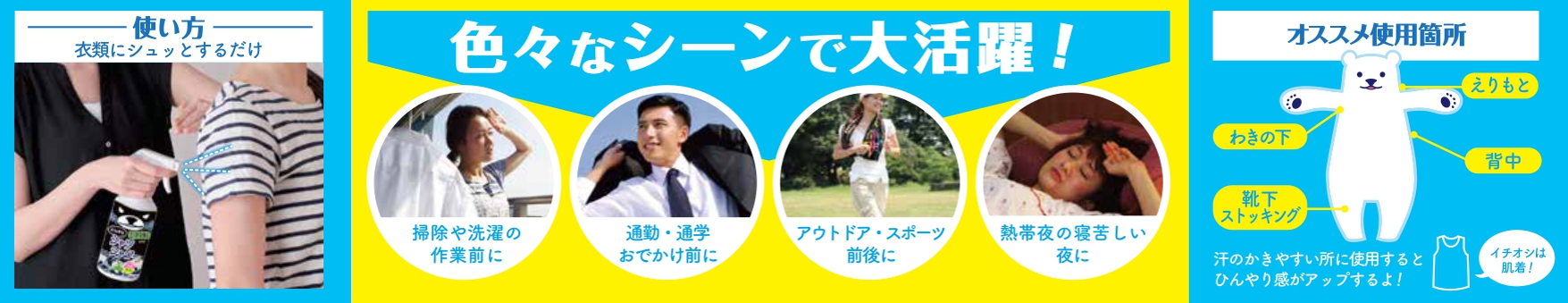 お出かけ前の衣類にスプレーするだけで、気化熱とメントールの作用でひんやり涼感!涼感は30分~1時間程度持続します。一度乾いても、汗をかくたびにひんやりとした気持ちいい冷涼感が持続します。