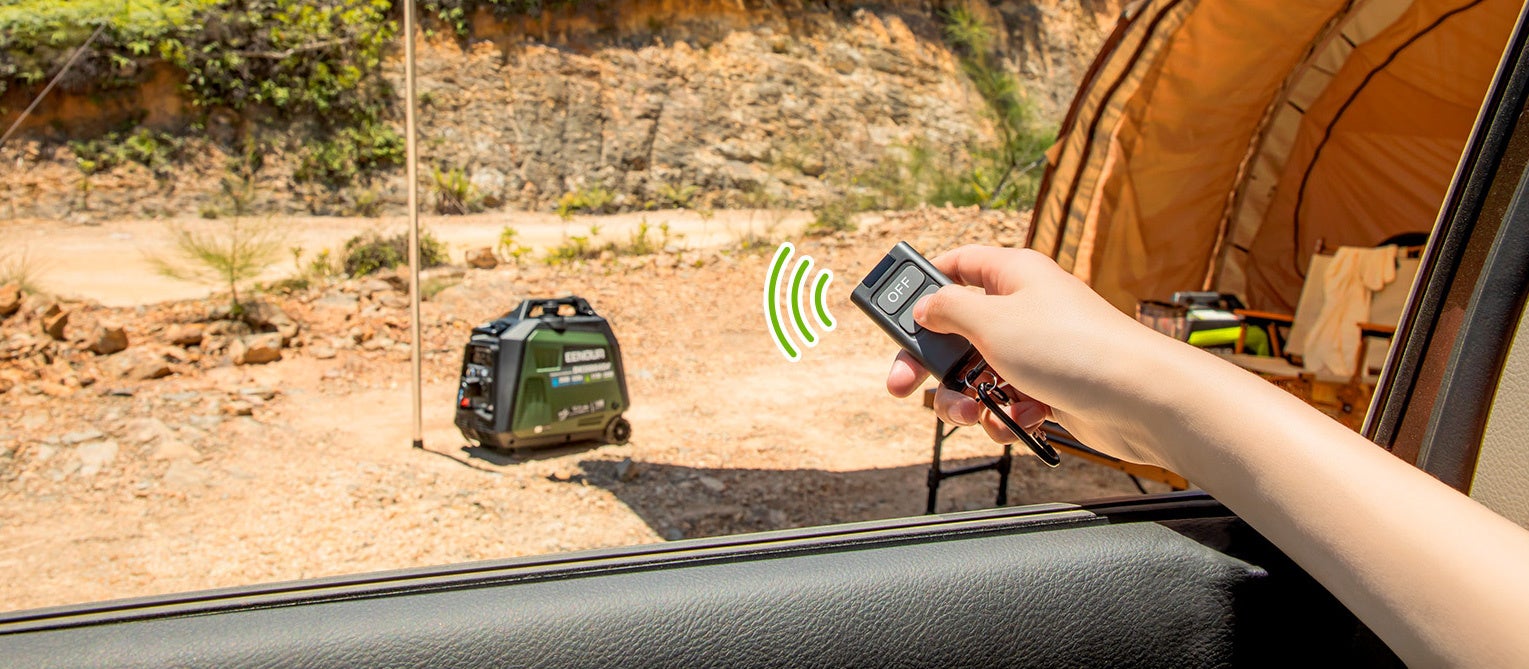 セルスターターを搭載、誰でもワンプッシュで簡単にエンジンを始動することができます。さらに、付属のリモコンを使うと、遠く離れても発電機のON/OFFを手軽に操作が可能です。仕事中でなかなか手が離せない時にはわざわざ移動する面倒がなくなり、とても便利です。また、セルスターター用バッテリーの残量がゼロになる時でもリコイルスターターでエンジンをかけさせます。