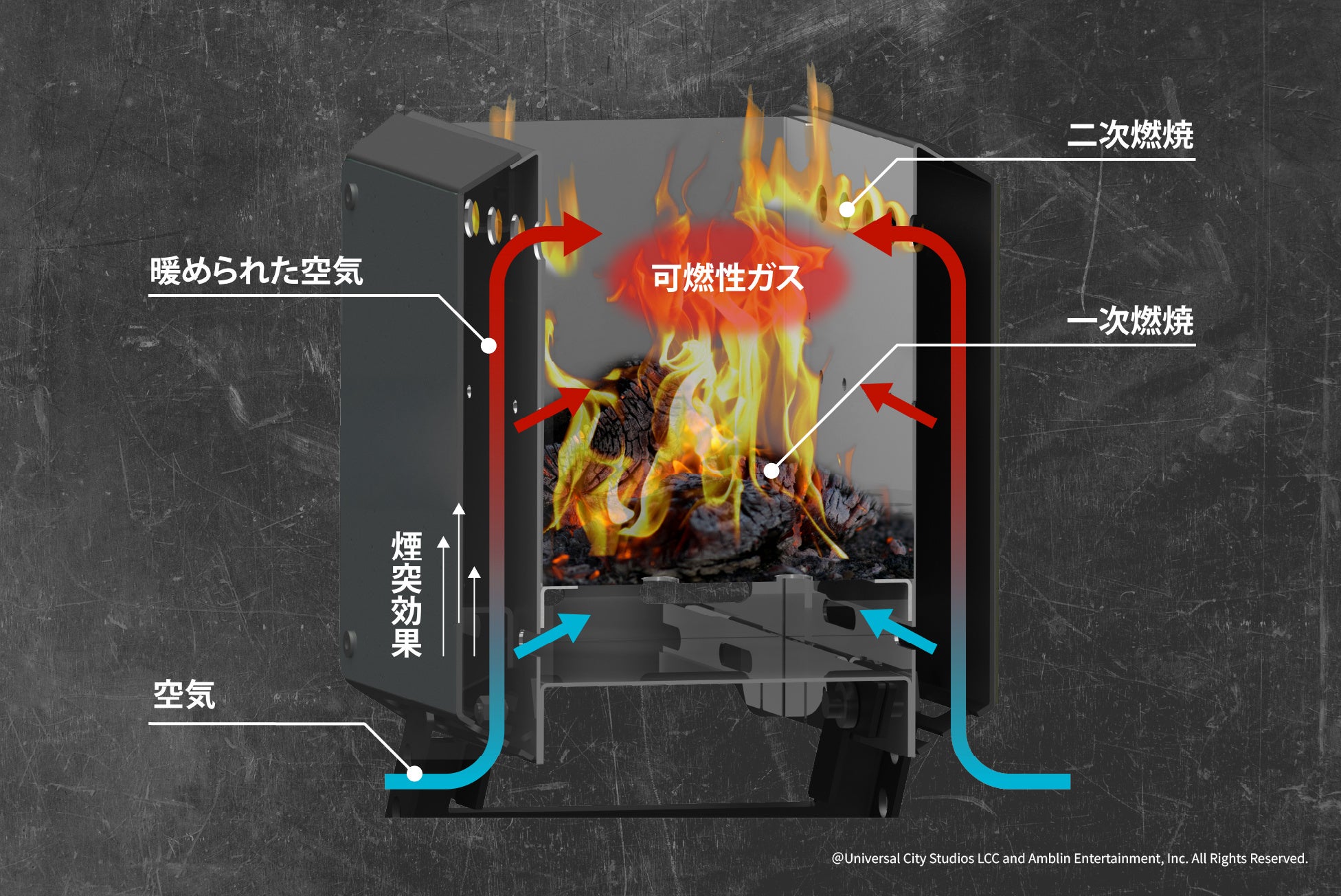 トヨトミが開発した二次燃焼システムにより、燃焼効率が高く、煙の少ない美しい炎を実現します。一次燃焼で燃え切らなかった煙(未燃ガス)を二次燃焼用の空気孔から供給される高温の空気で再度燃焼させることで、煙の量を大幅に削減。長時間にわたって美しい炎の揺らぎを楽しむことができます。高い燃焼効率は燃料の節約にもつながり、経済的で環境にも優しい設計です。