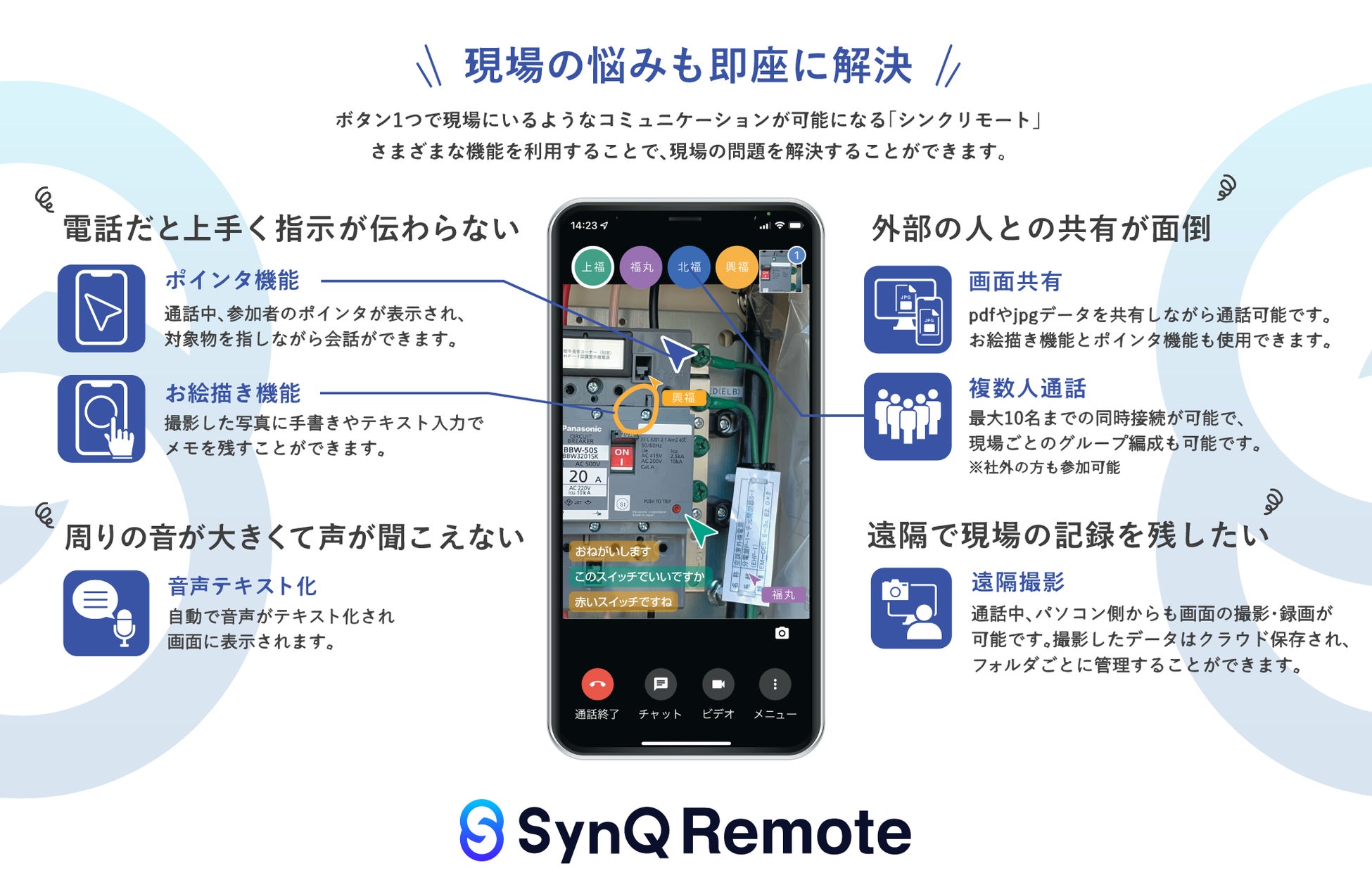 SynQ Remote(シンクリモート)は現場の「あれ、これ、それ」が伝わるビデオ通話ツールです。遠隔地にいる管理者と現場担当者が、リアルタイム映像を双方で見ながら、まるで横にいるかのように現場の確認・指示が可能です。双方向の視覚的指示が可能なポインタ機能や、騒音環境でもやり取りが可能な音声文字起こしチャット機能など現場に特化した機能を多数搭載します。さらに、現場に設置されたQRコードを読み込むことでビデオ通話が始まり、アプリ無し・アカウント登録無しで手軽に始められることも強みとしています。 大東建託などの建設業や電気・鉄道関連のインフラ業、安川電機やカワサキロボットサービスなどの製造業を中心にご導入いただいております。