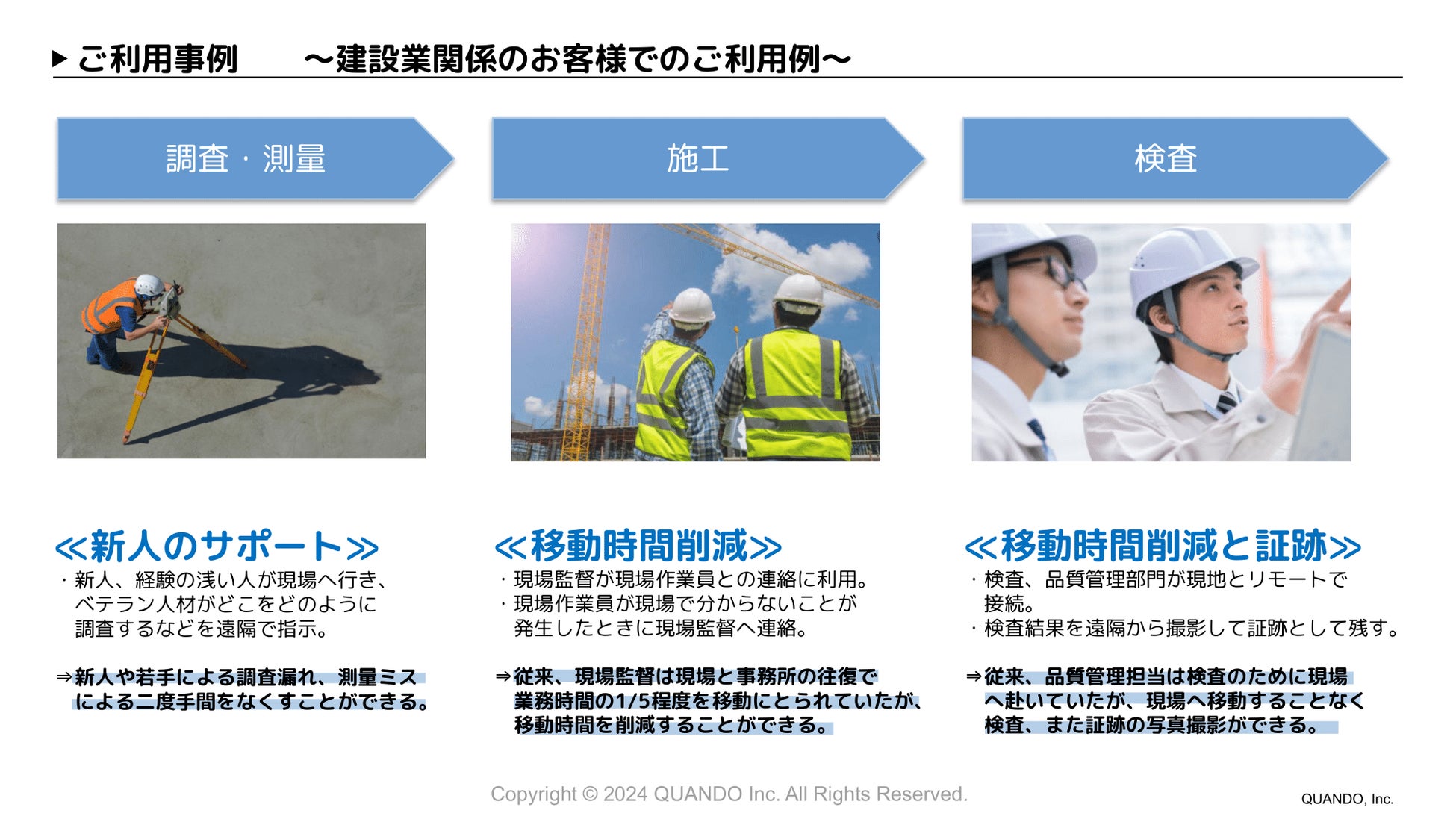 2024年問題として知られる、少子高齢化に伴う労働力不足や、高度成長期の熟練技術者の引退など、労働環境の変化が加速しており、現場の労働力の重要性がより増してきています。SynQRemoteは属人的な業務を無くして「より少ない人数で多くの現場を、品質を担保しながら動かす」ことを可能にします。1人あたりおよそ1〜2時間かかっている移動時間を減らしてコストを削減しながら働き方改革にも繋がります。さらに、遠隔地からでも作業状況を管理できるようになることで、リアルタイムで共有しながらナレッジを蓄積することが可能です。今回のIT導入補助金をご利用いただくことで、導入コストを抑えながら現場の皆様の働き方改革に繋がる事例を紹介しております。