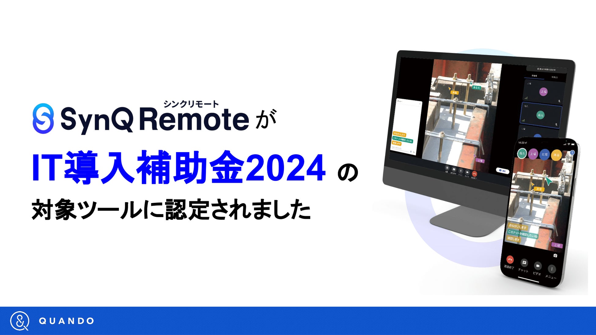 建設現場や製造現場向けの遠隔支援ツール「SynQ Remote(シンクリモート)」を開発提供する株式会社クアンド(本社:福岡県北九州市、代表取締役CEO:下岡 純一郎)は、「IT導入補助金2024」(以下「IT導入補助金」)制度におけるIT導入支援事業者として採択されたことをお知らせいたします。