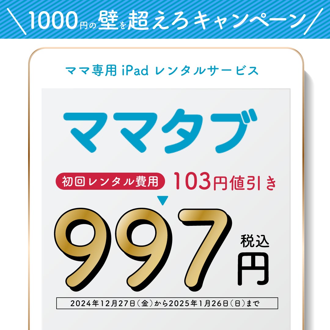 「温故知創でサステナブルな社会をつくる」を使命に掲げる株式会社ニューズドテック(本社:東京都中央区、代表:粟津浜一、以下ニューズドテック)は2024年12月27日(金)から2025年1月26日(日)にかけて、ママ専用iPadレンタルサービス「ママタブ」の初回レンタル費用(1ヶ月間のレンタル費用)を税込1100円から103円を引いた税込997円になる「1000円の壁を超えろ」キャンペーンを開催します。